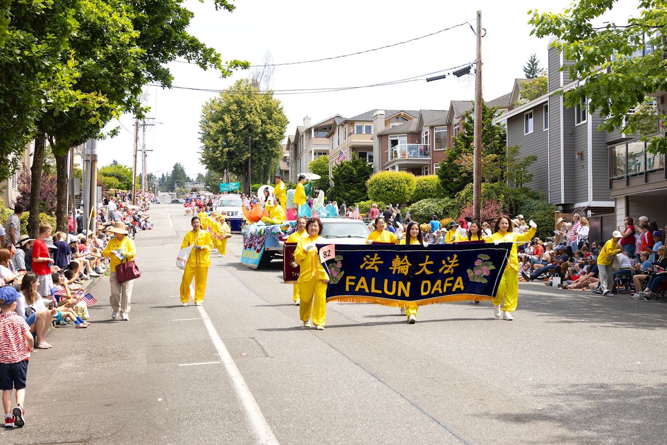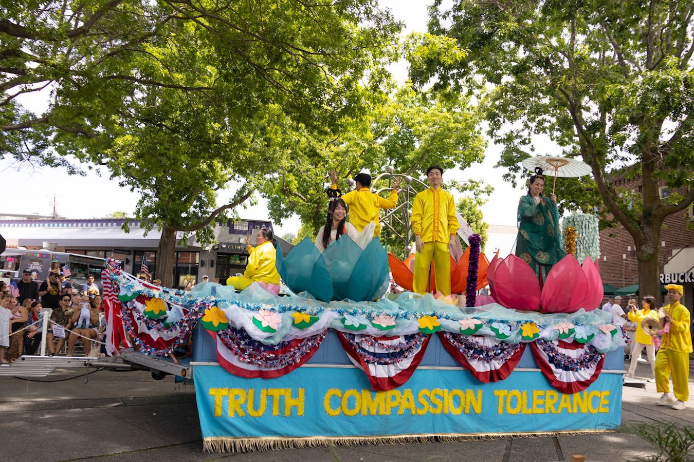 法轮功学员在游行中展现的花车被美丽的祥云和各色花朵精心点缀,多彩的莲花在祥云中升起,同时,庆祝美国独立日精神的星条旗装饰也围绕着花车的周边。花车上有多名身着炼功服和仙女服的学员,他们有的在展示法轮功五套缓、慢、圆的功法,有的在向观众们挥手致意。他们优雅美好的展现和散发出的纯正能量,唤醒着人们内心深处对真、善、忍的渴望。