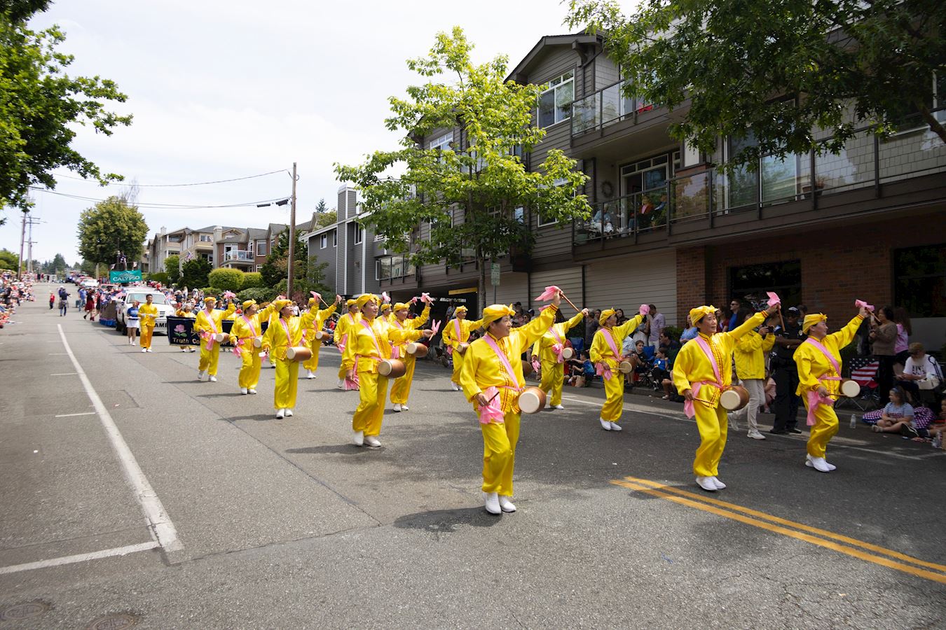 由西雅图法轮功学员组成的神采奕奕的腰鼓队,在夏日里随着优美的旋律,为观众们表演了《法轮大法好》、《喜庆》等腰鼓舞,向观众展现中华传统的神传文化。精彩的表演深深感染了现场观众。每一曲腰鼓表演后,观众们都报以热烈的掌声和欢呼,表达了他们对法轮功团体的认可和支持。