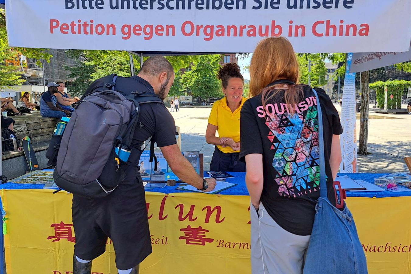 “我站在德国市中心大街上讲真相,特别想告诉我的同胞,不要拒绝真相,别听信中共栽赃法轮功的那些谎言,不被洗脑了,不被中共的谎言毒害了。你能停下来,听我讲真相,说明你能独立思考,不盲从,在选择善恶。”