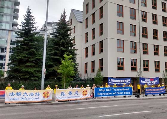 在法轮功和平反迫害26年之际,七月十七日,加拿大卡尔加里部份法轮功学员在中领馆前集会,谴责中共全面升级的跨国镇压。