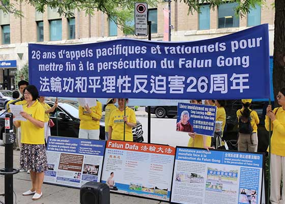 七月十七日,在中共对法轮功的迫害持续26年之际,法轮功学员在加拿大蒙特利尔中领馆前举行反迫害集会,要求立即停止迫害。