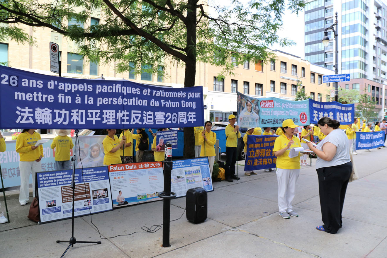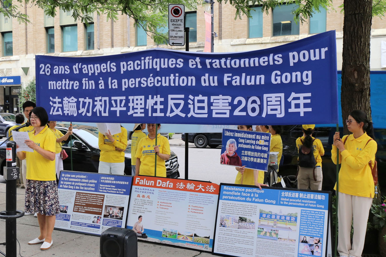 ![]() 图1~2:二零二五年七月十七日,在中共对法轮功的迫害持续二十六年之际,法轮功学员在蒙特利尔中领馆前举行反迫害集会。 |