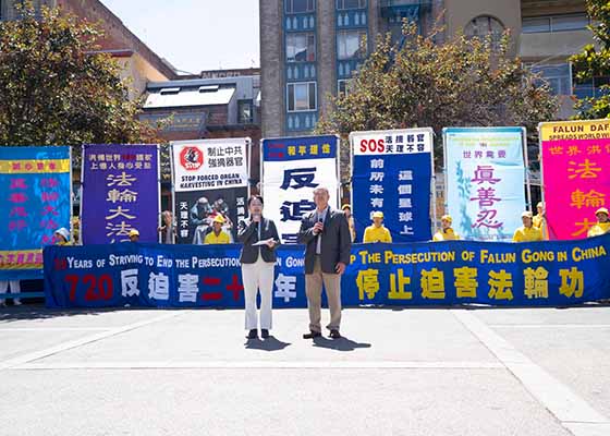 7月19日,旧金山湾区的法轮功学员和各界人士在旧金山唐人街花园角广场集会,谴责中共对法轮功长达26年的迫害。