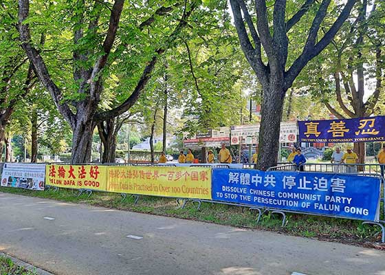 7月18日,比利时部分法轮功学员在布鲁塞尔中使馆前静坐、炼功,并向公众揭露中共迫害法轮功真相、及不择手段加剧跨国镇压的行径。