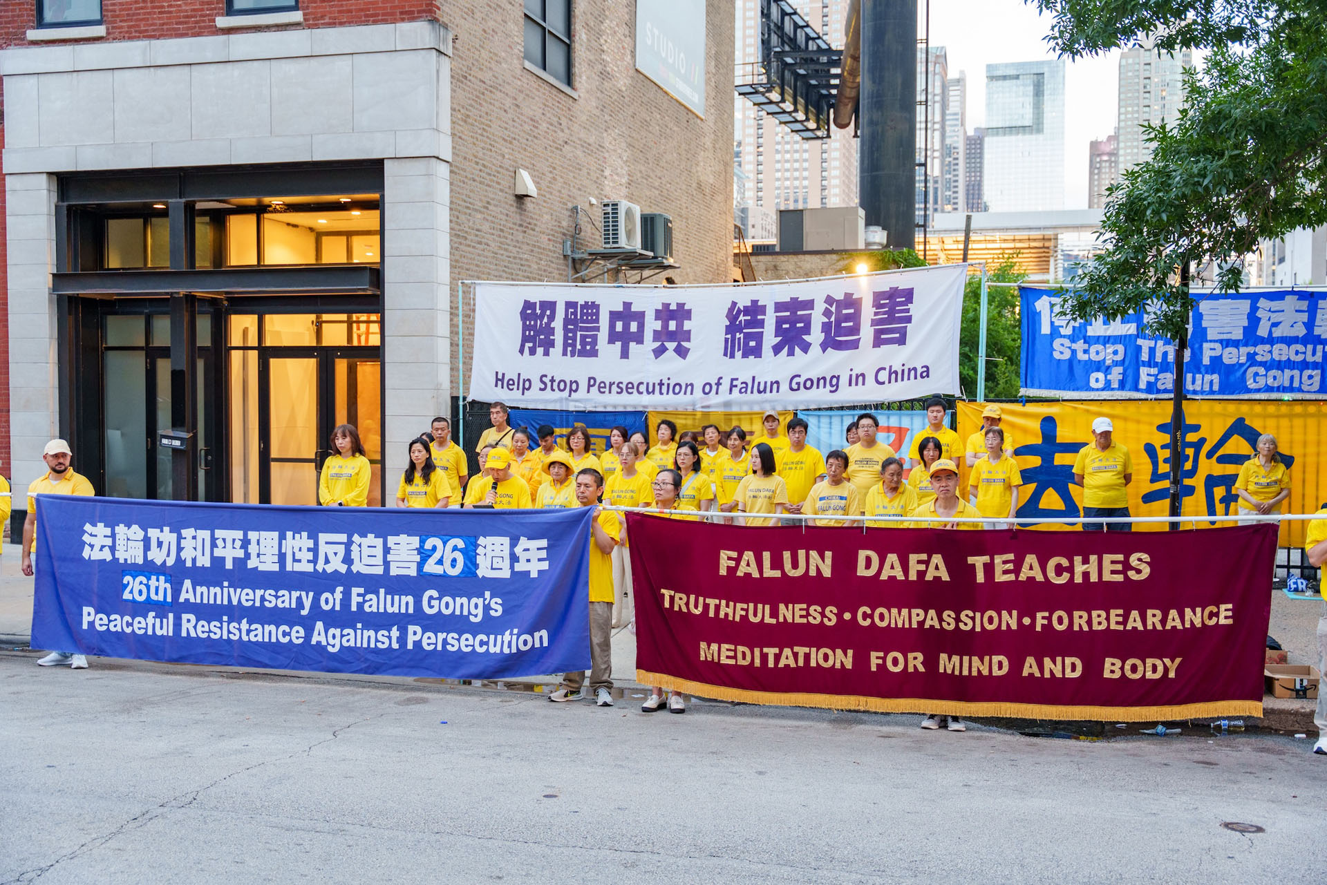 图1~3:二零二五年七月十九日,大芝加哥地区的部份法轮功学员在中领馆前集体炼功,举行和平反迫害的炼功、集会和烛光夜悼活动,呼吁制止中共对法轮功学员长达二十六年的迫害。