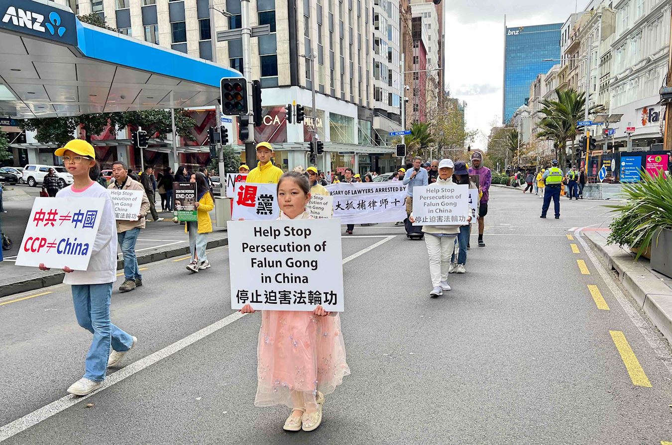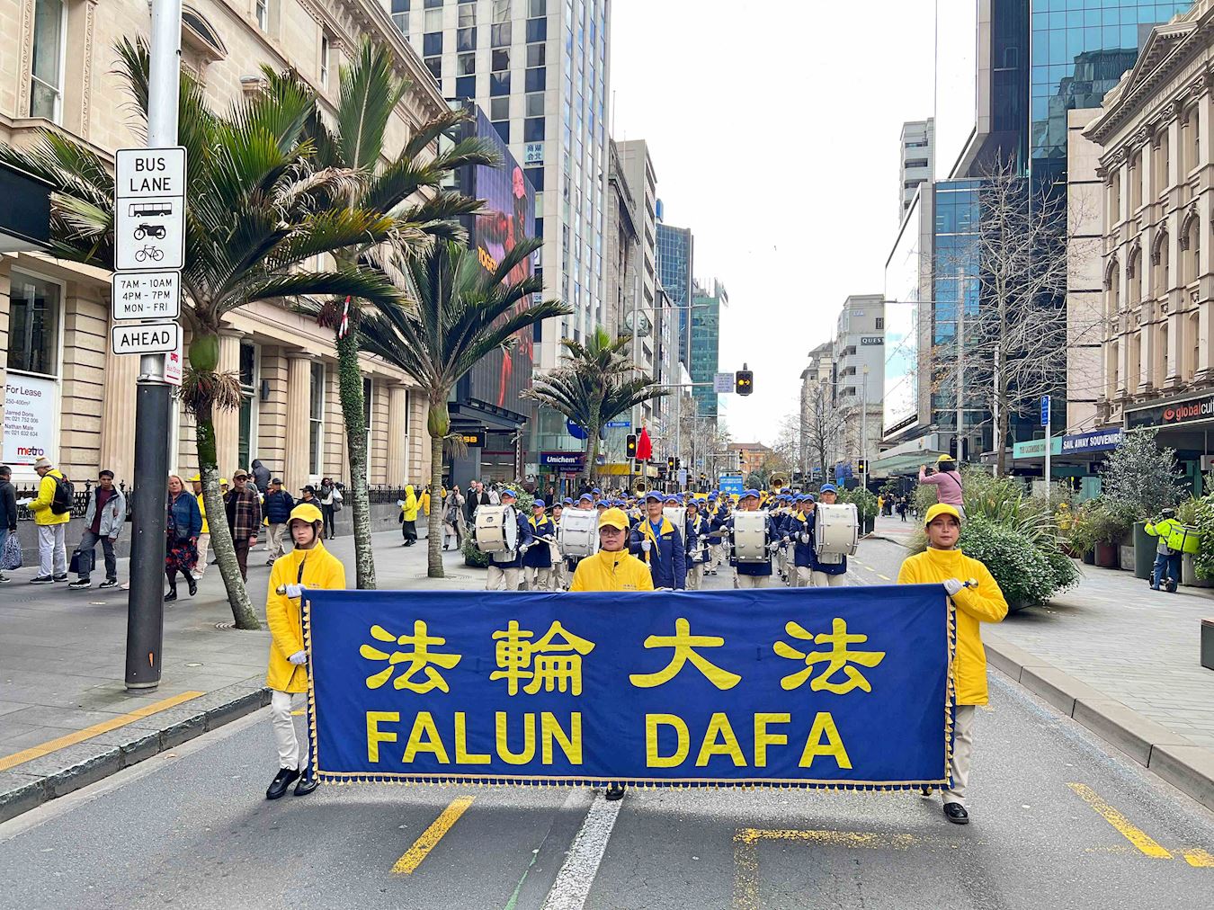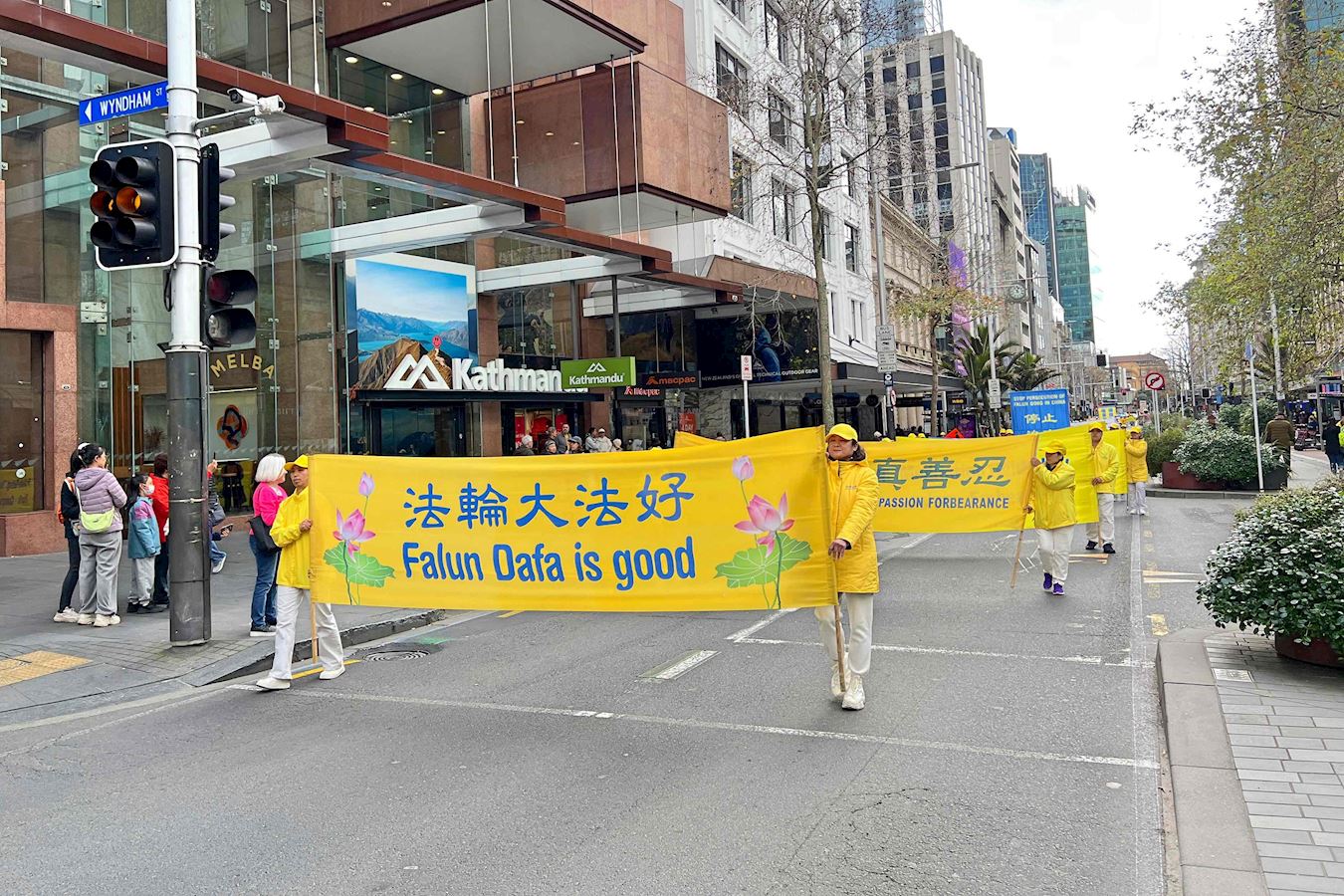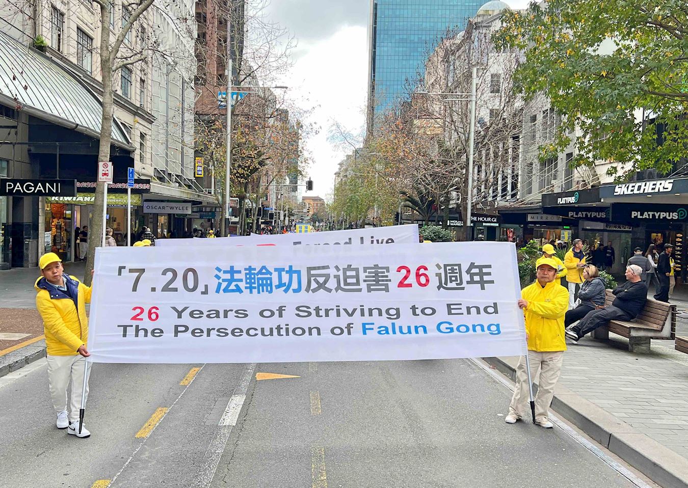 '图1~14:二零二五年七月十九日星期六,新西兰法轮功学员在奥克兰市中心皇后大街游行,反对中共长达二十六年的迫害。'