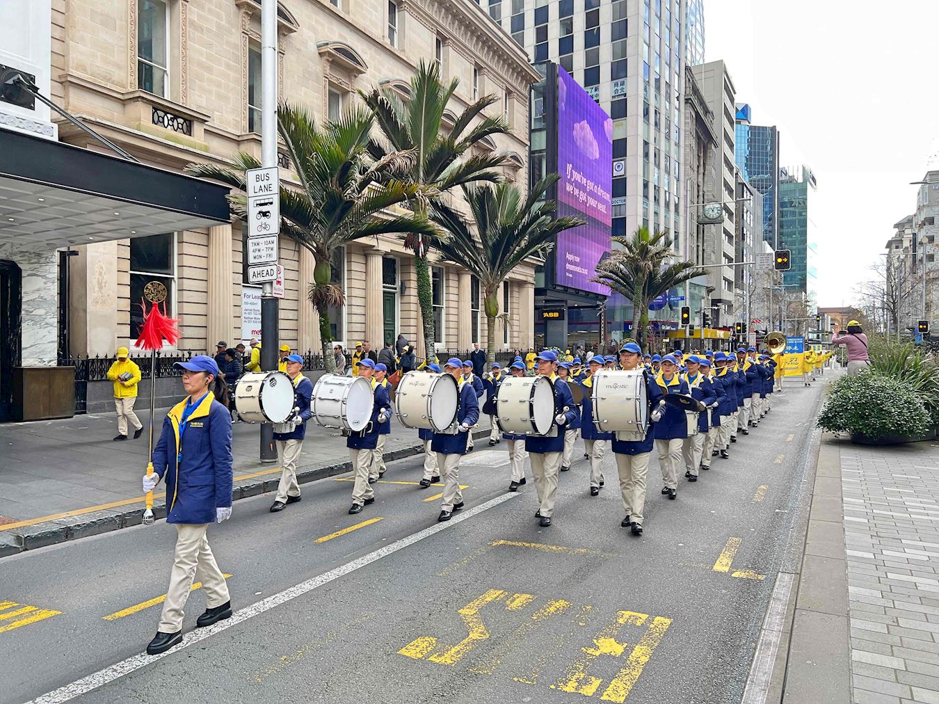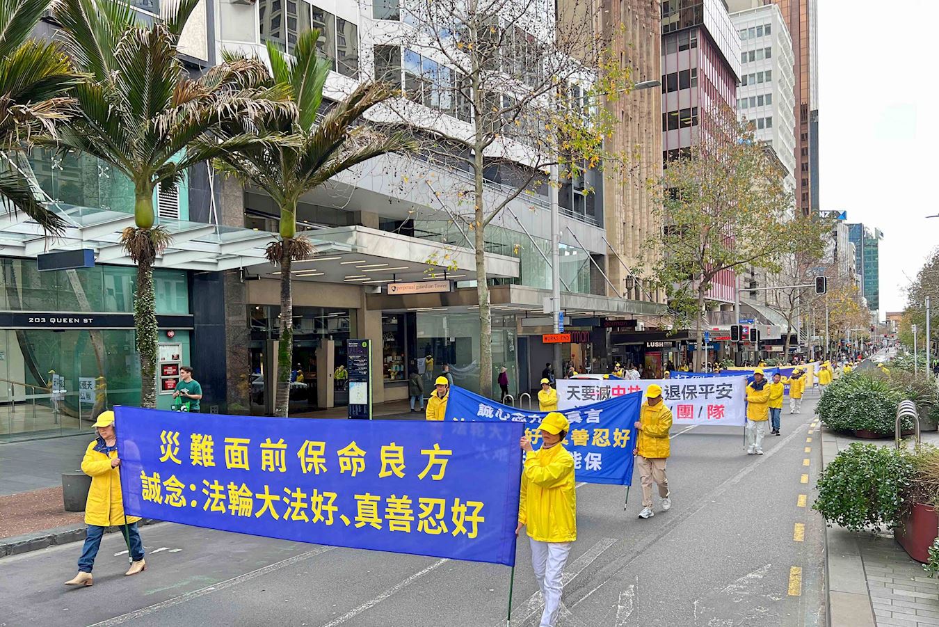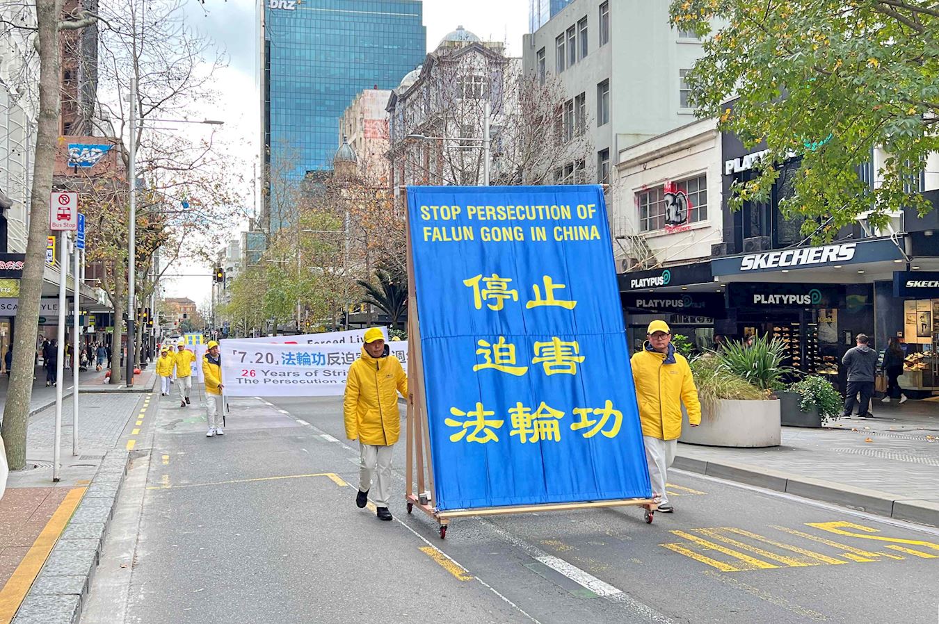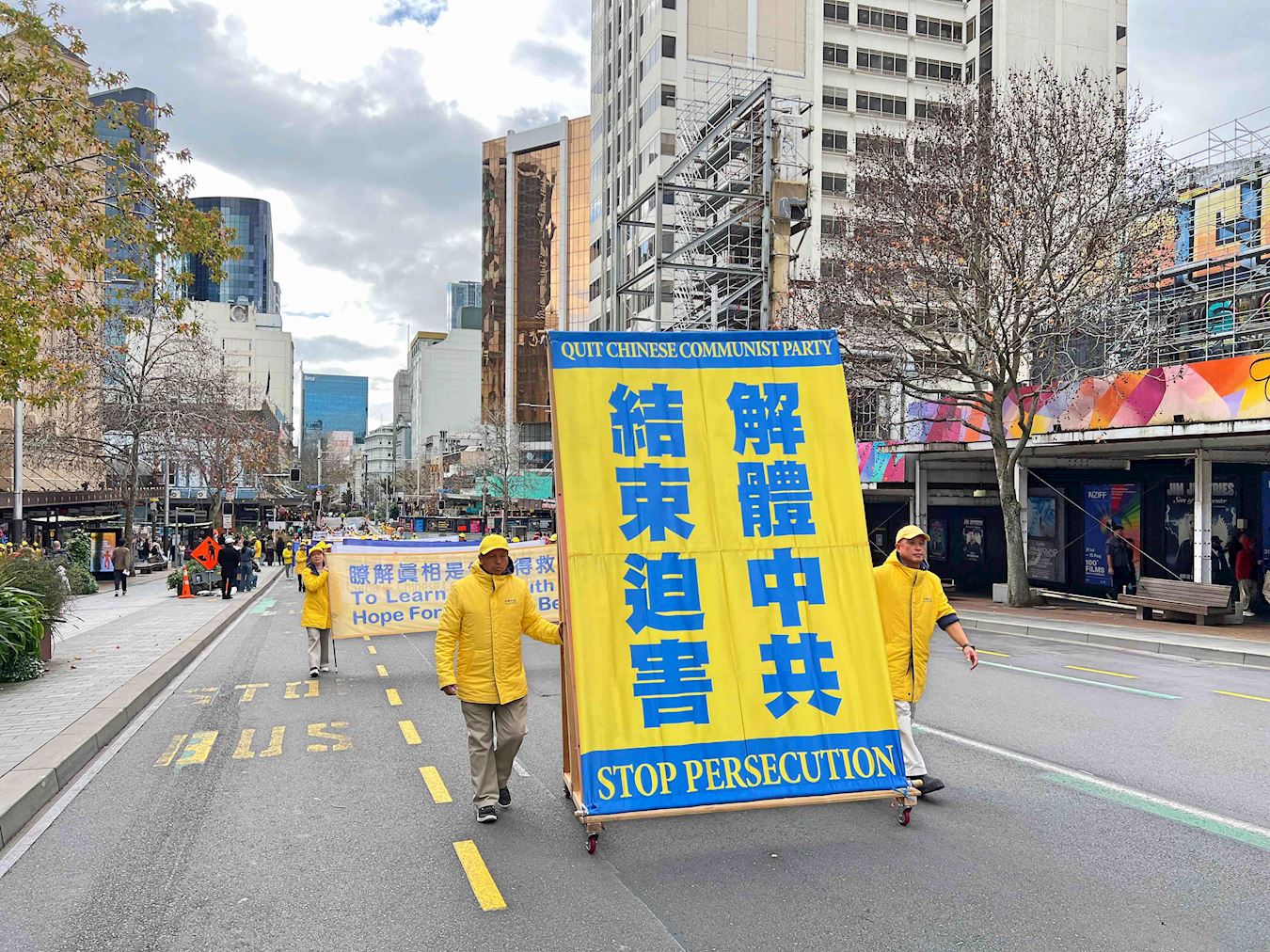 '图1~14:二零二五年七月十九日星期六,新西兰法轮功学员在奥克兰市中心皇后大街游行,反对中共长达二十六年的迫害。'