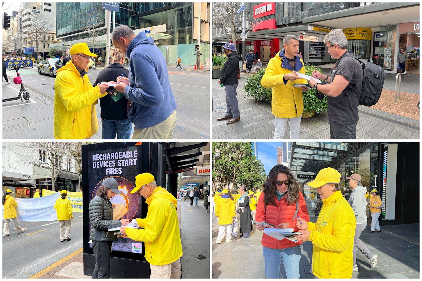 '图15~16:法轮功学员游行、集会时,听闻真相的人们都签名支持法轮功反迫害。'