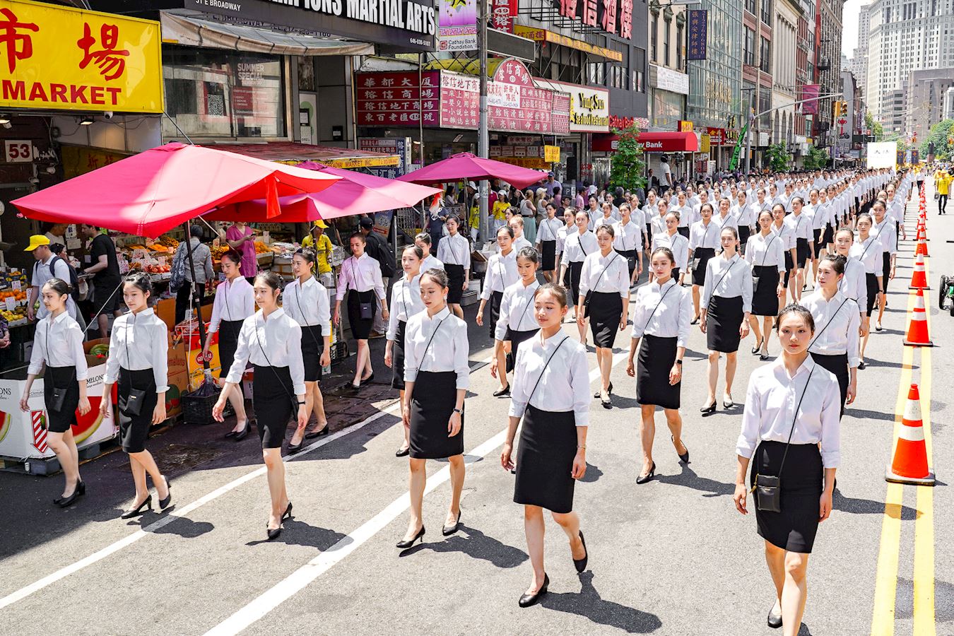在第一方阵中,人们惊喜的看到,数百位神韵艺术家们卸下舞台华服,换上了利落的白衬衣黑裙裤,神采奕奕、英姿焕发的行进在曼哈顿的大街上。