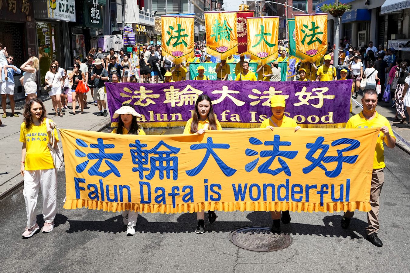 '图5~7:二零二五年七月二十日,部份神韵艺术家和法轮功学员在曼哈顿华埠举行法轮功反迫害26年大游行。'