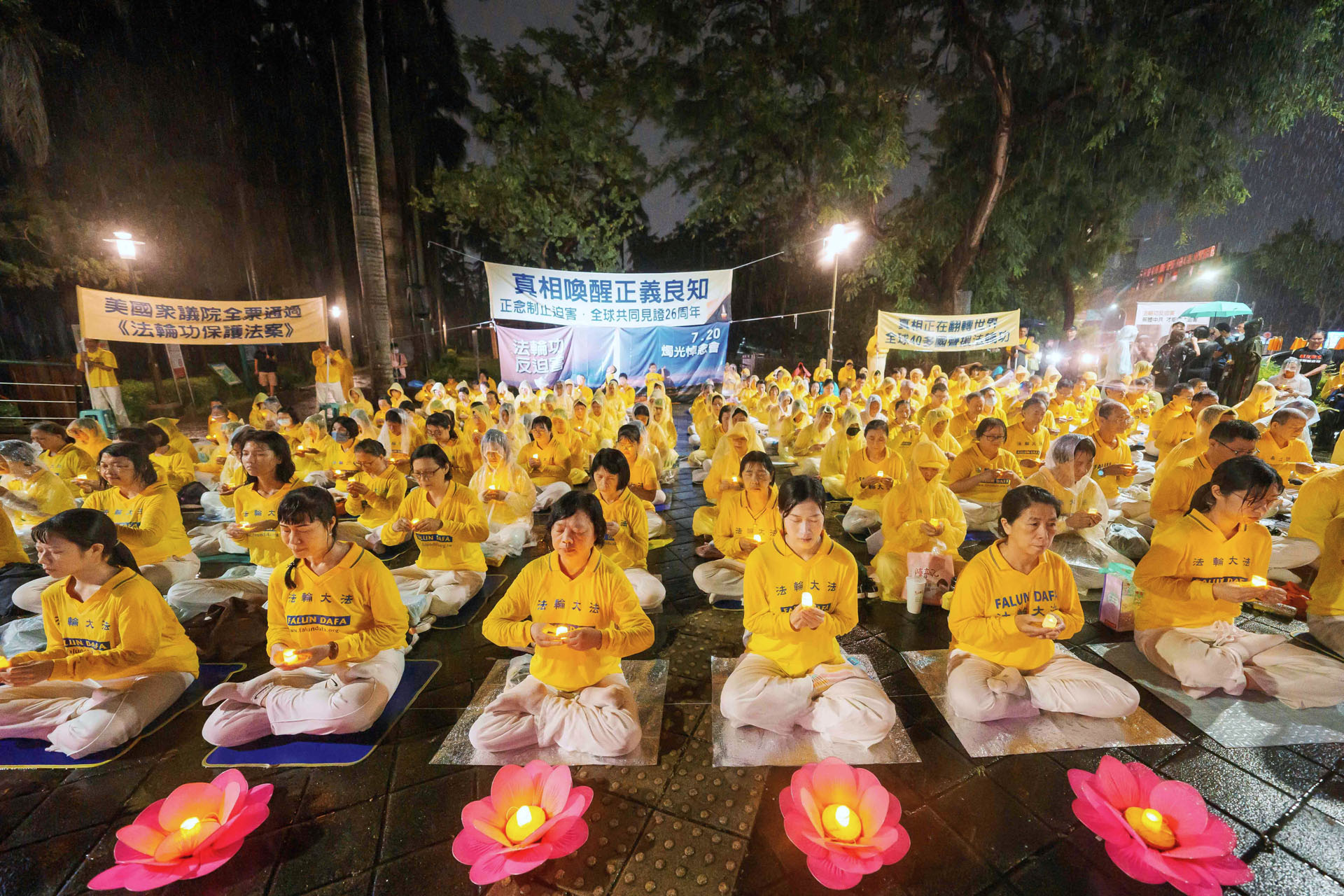 图1~2:二零二五年七月十九日晚间,台湾中南部地区包括云林、嘉义、台南部份法轮功学员,于台南公园和嘉义家扶中心会议厅两地举办反迫害二十六周年集会及烛光夜悼。