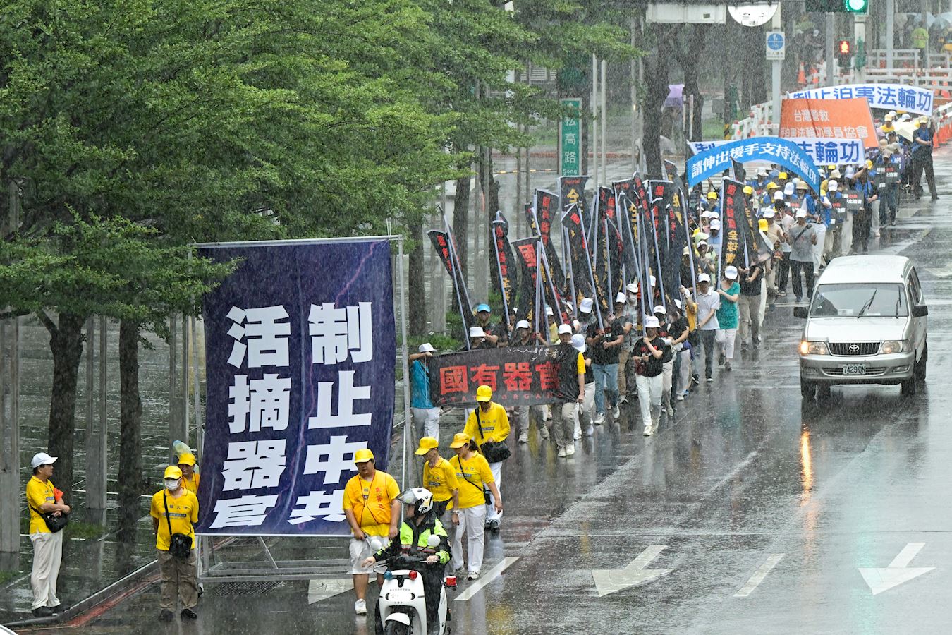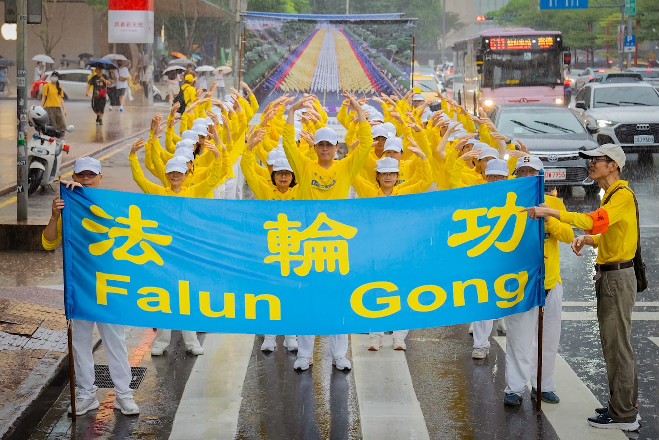 【明慧网二零二五年七月二十一日】(明慧记者李佳、黄宇生台北采访报道)二零二五年七月十九日下午,台北、桃园、新竹、苗栗部分法轮功学员在风雨中举行反迫害二十六周年大游行。
