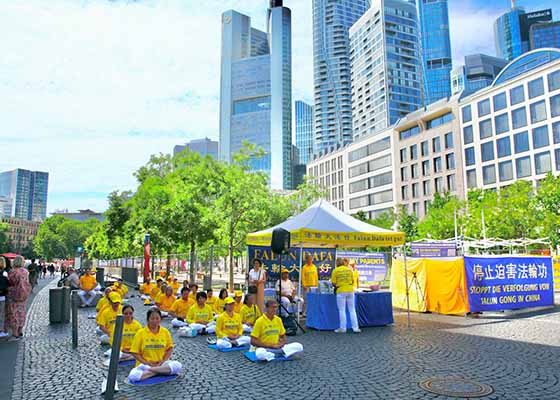 法轮功学员7月19日在德国法兰克福举办了反迫害26年活动,德国欧洲议员米歇尔・盖勒、中国问题专家吴曼扬到场声援。