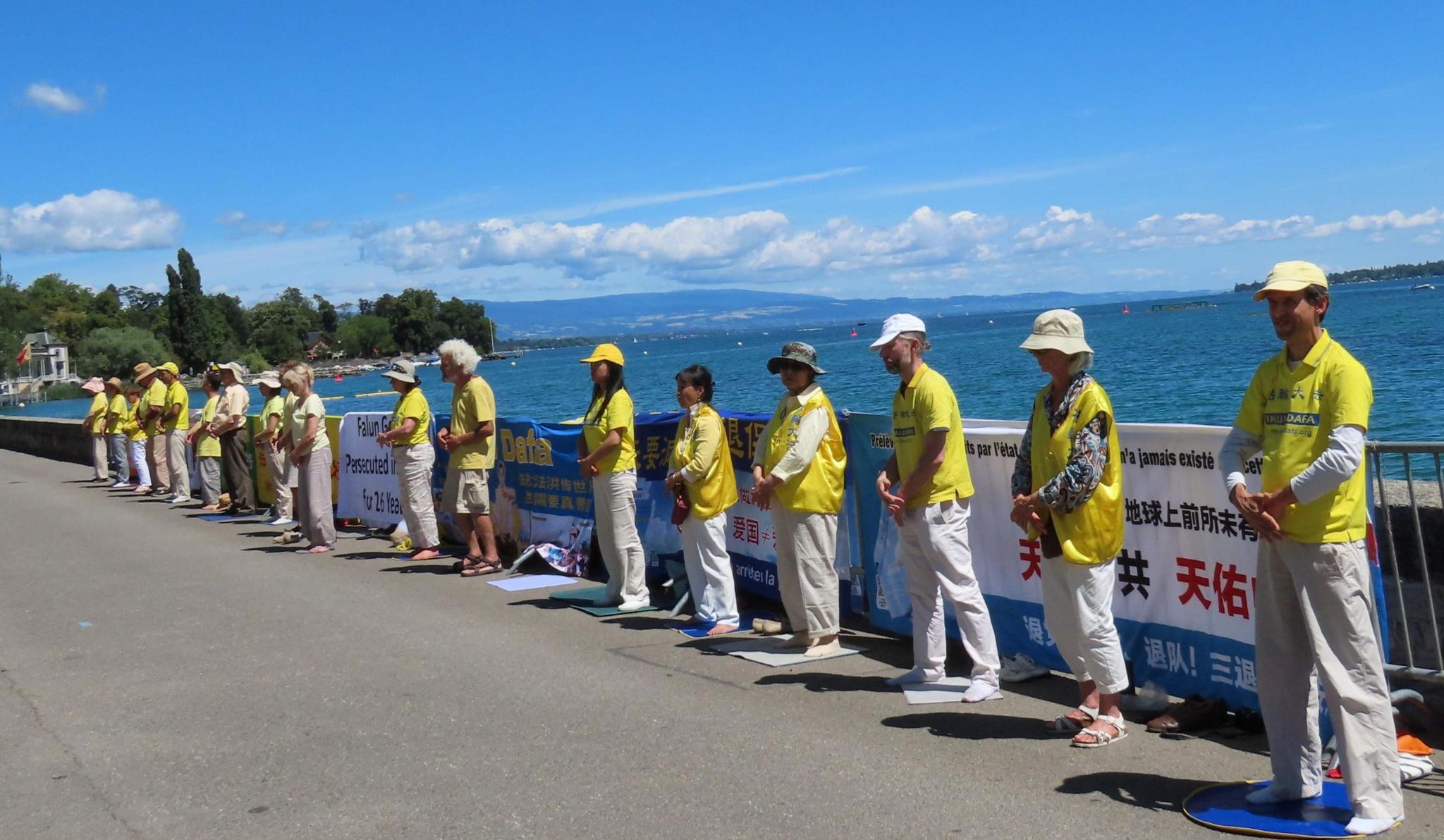 【明慧网二零二五年七月二十三日】在法轮功学员反对中共迫害26周年到来之际,二零二五年七月十七日,瑞士法语区和法国邻近地区的部分法轮功学员,在联合国人权事务高级专员办事处前的日内瓦湖畔,举行集会,揭露和谴责中共当局对法轮功学员长达26年的残酷迫害。四名瑞士议员到场支持,还有三十九名议员发来信件声援。