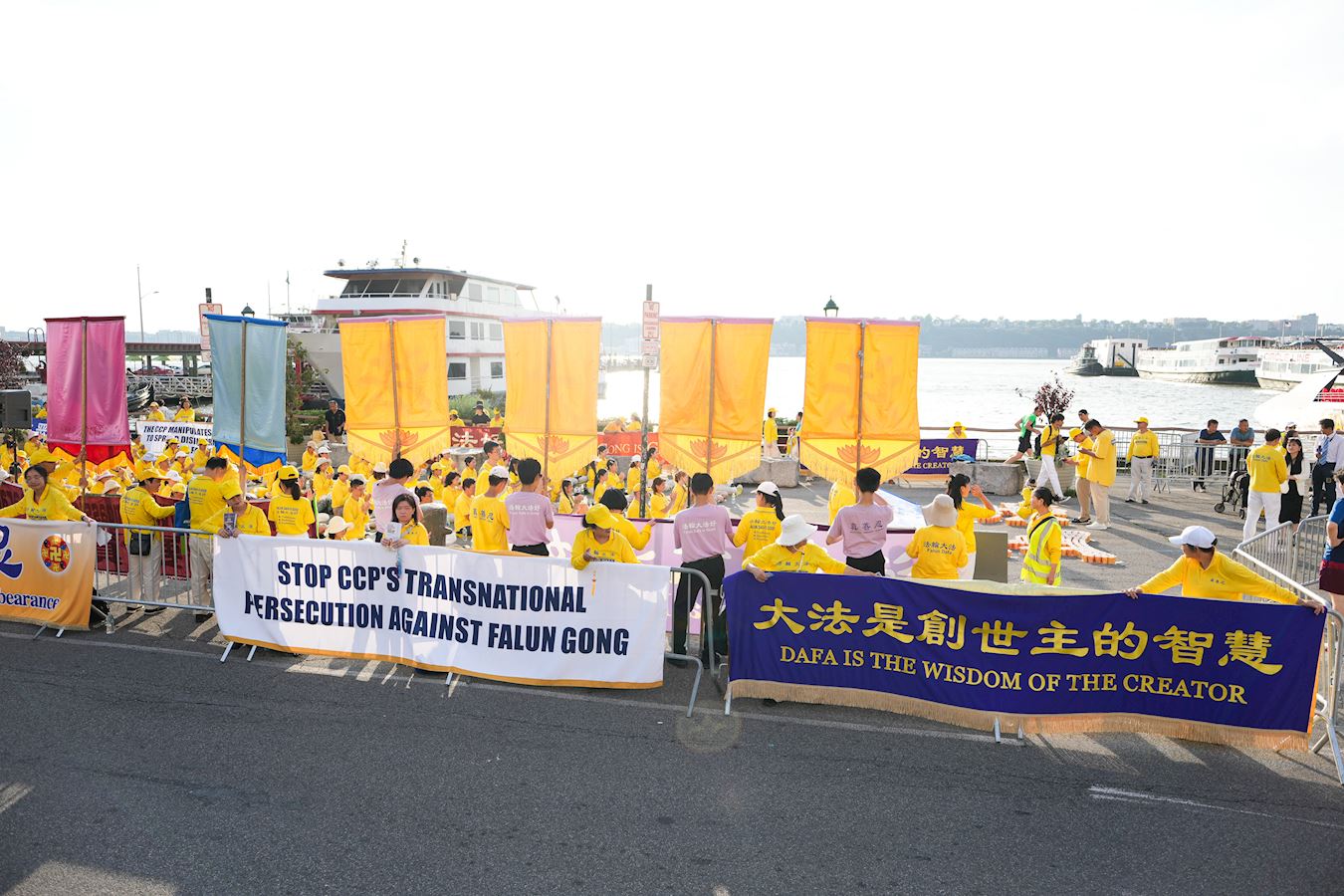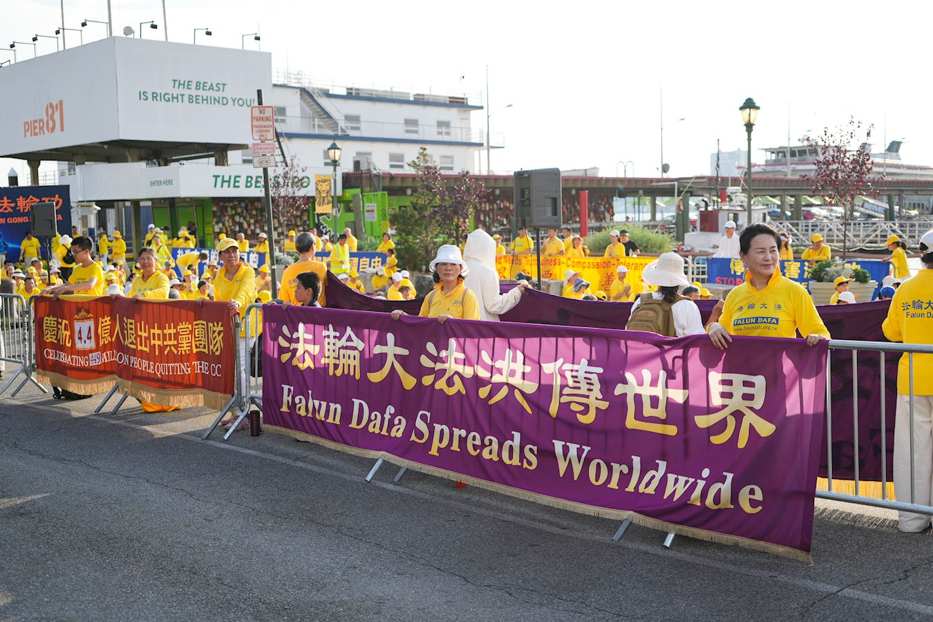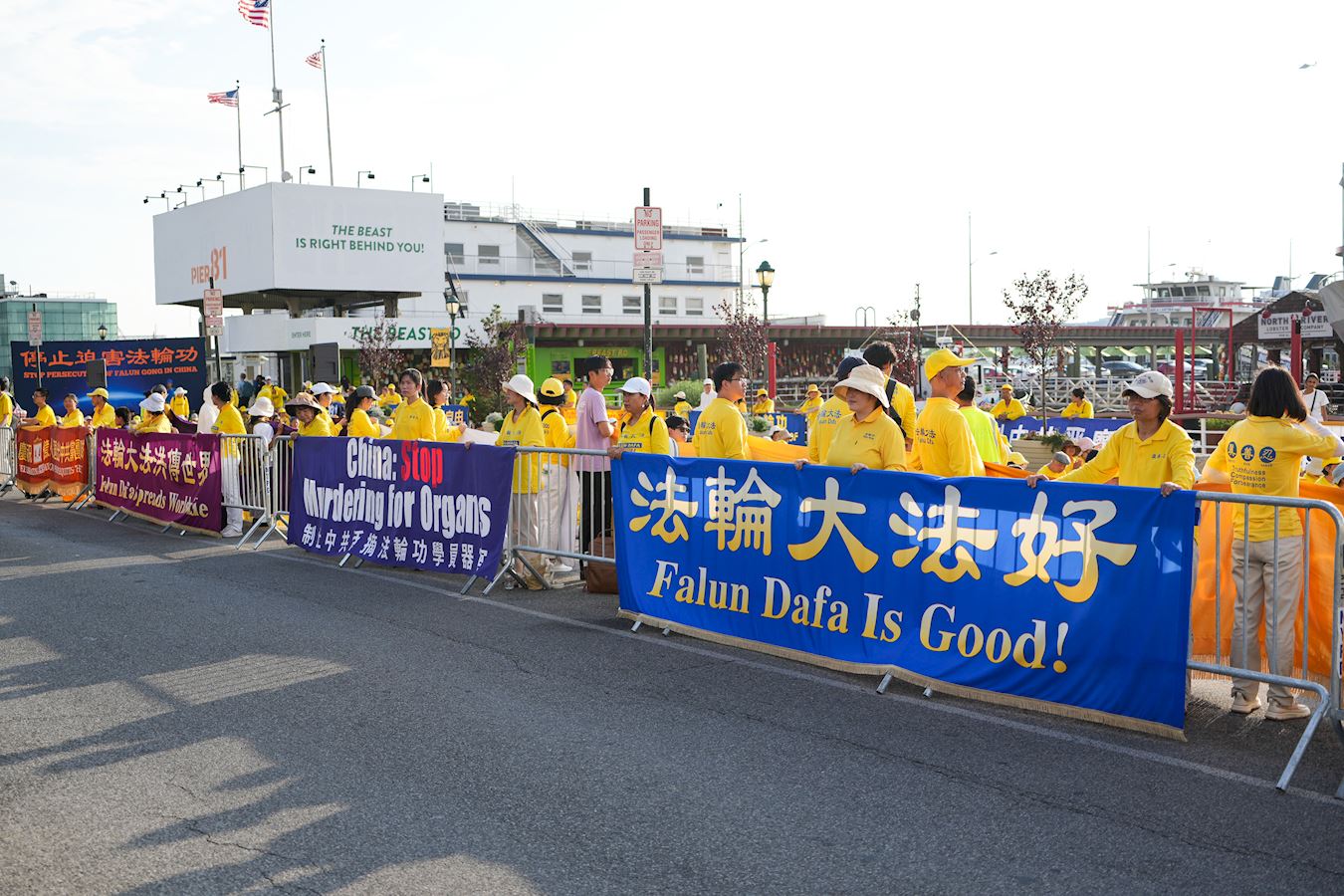 哈德逊河畔,行人络绎不绝,人们被眼前感人的场面所吸引,纷纷停下脚步。有的拍照,有的接过传单,有的与法轮功学员交谈,了解在中国发生的群体灭绝式的人权迫害,不少人在制止迫害的征签板上签下名字。