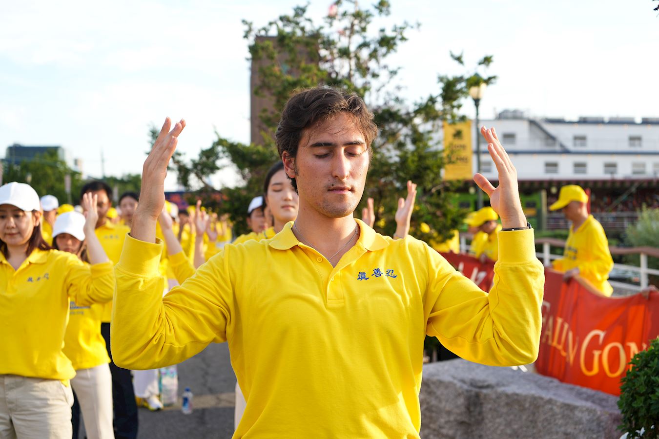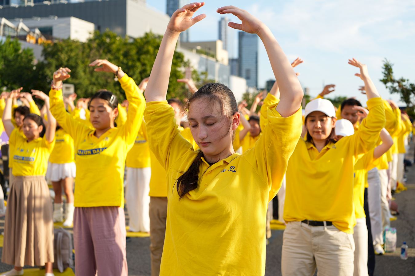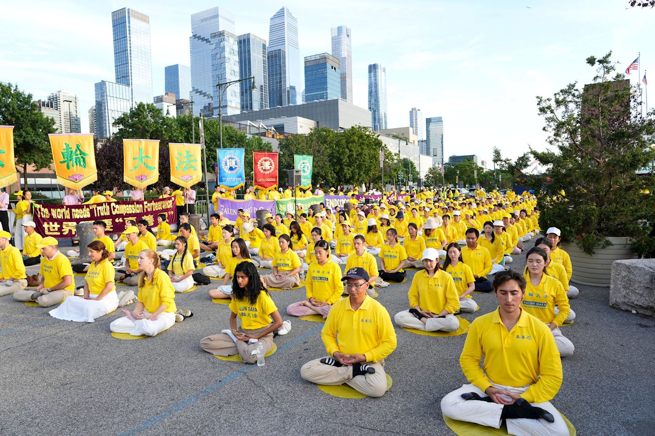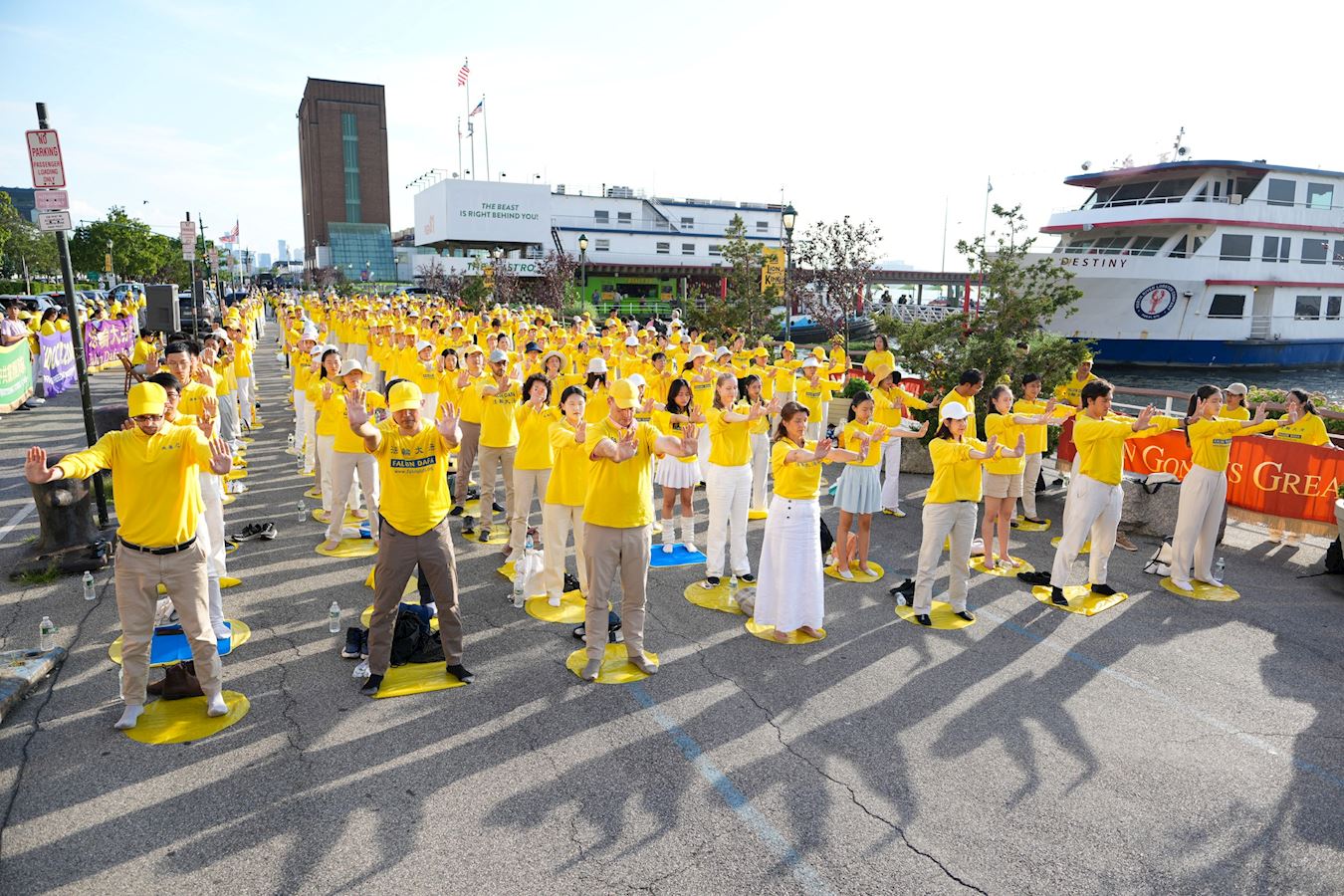 图7~18:二零二五年七月二十日傍晚,纽约部分法轮功学员数百人,在哈德逊河畔举行反迫害二十六年烛光夜悼。图为学员们拉起真相横幅,集体展示五套功法。