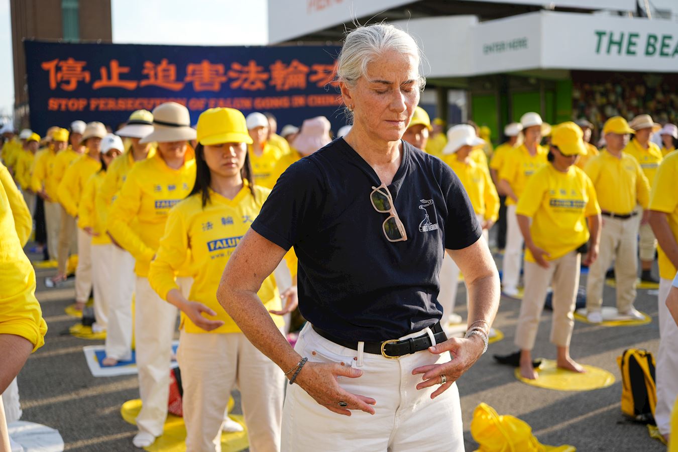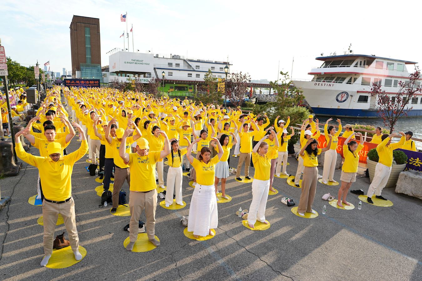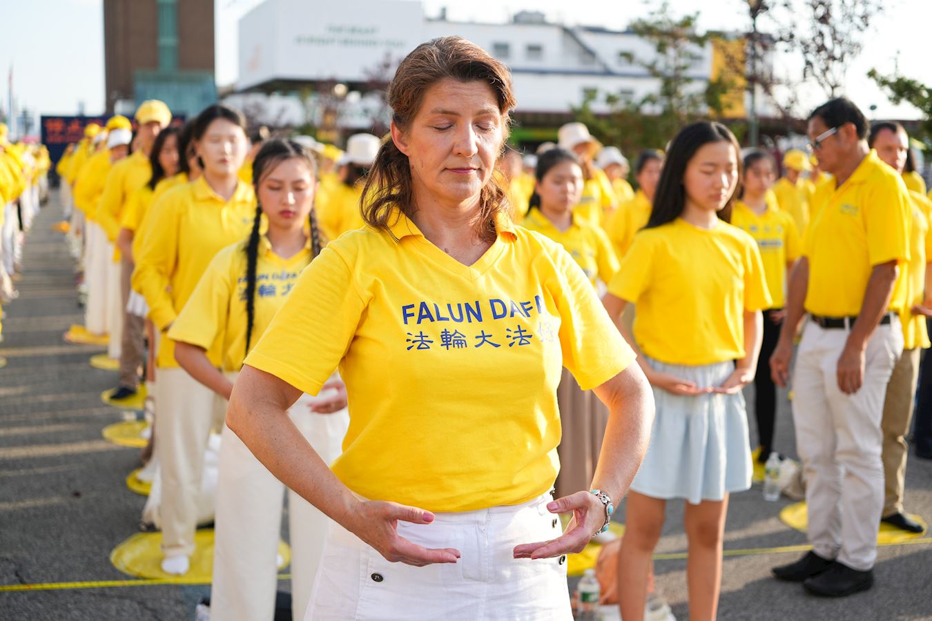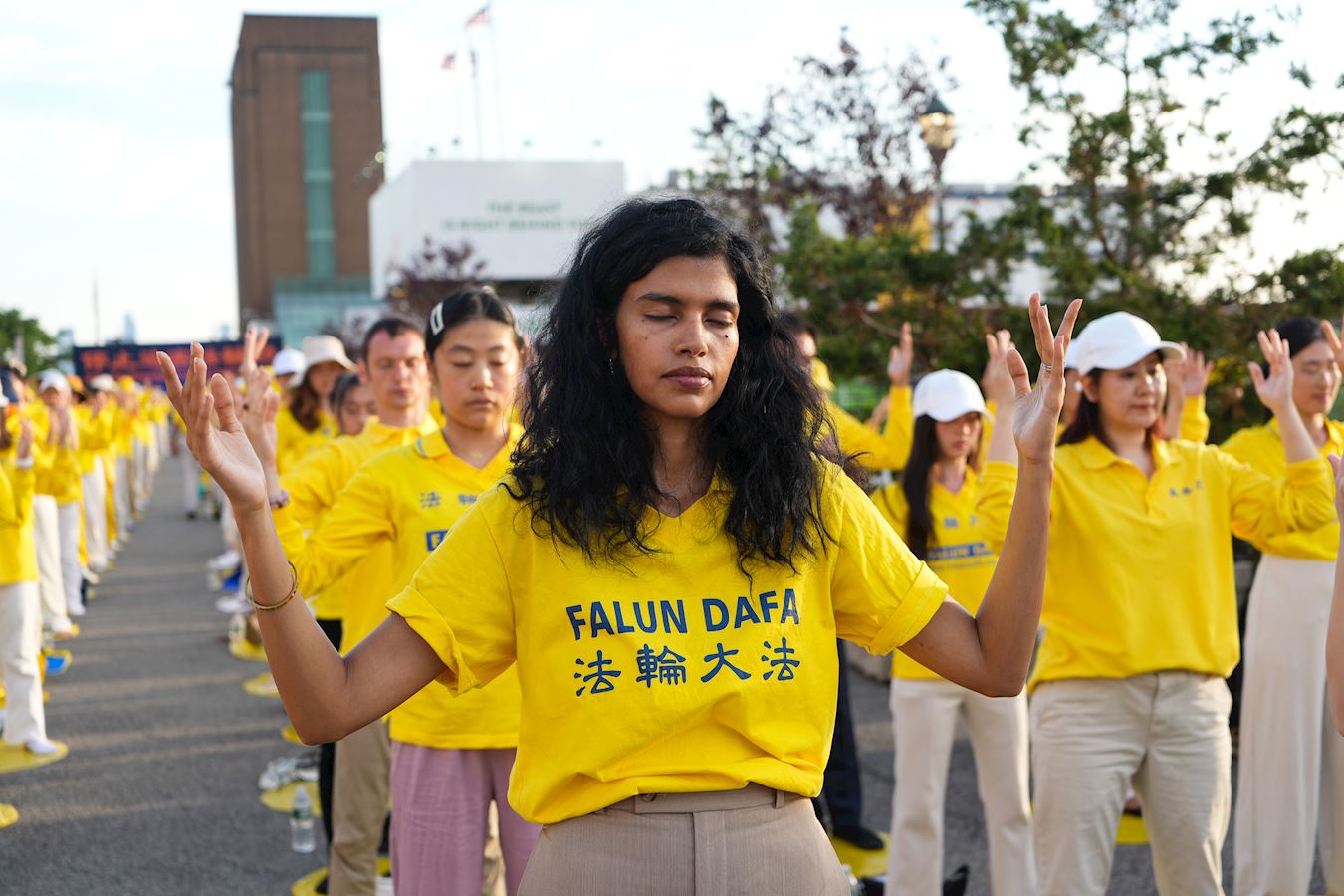 图7~18:二零二五年七月二十日傍晚,纽约部分法轮功学员数百人,在哈德逊河畔举行反迫害二十六年烛光夜悼。图为学员们拉起真相横幅,集体展示五套功法。