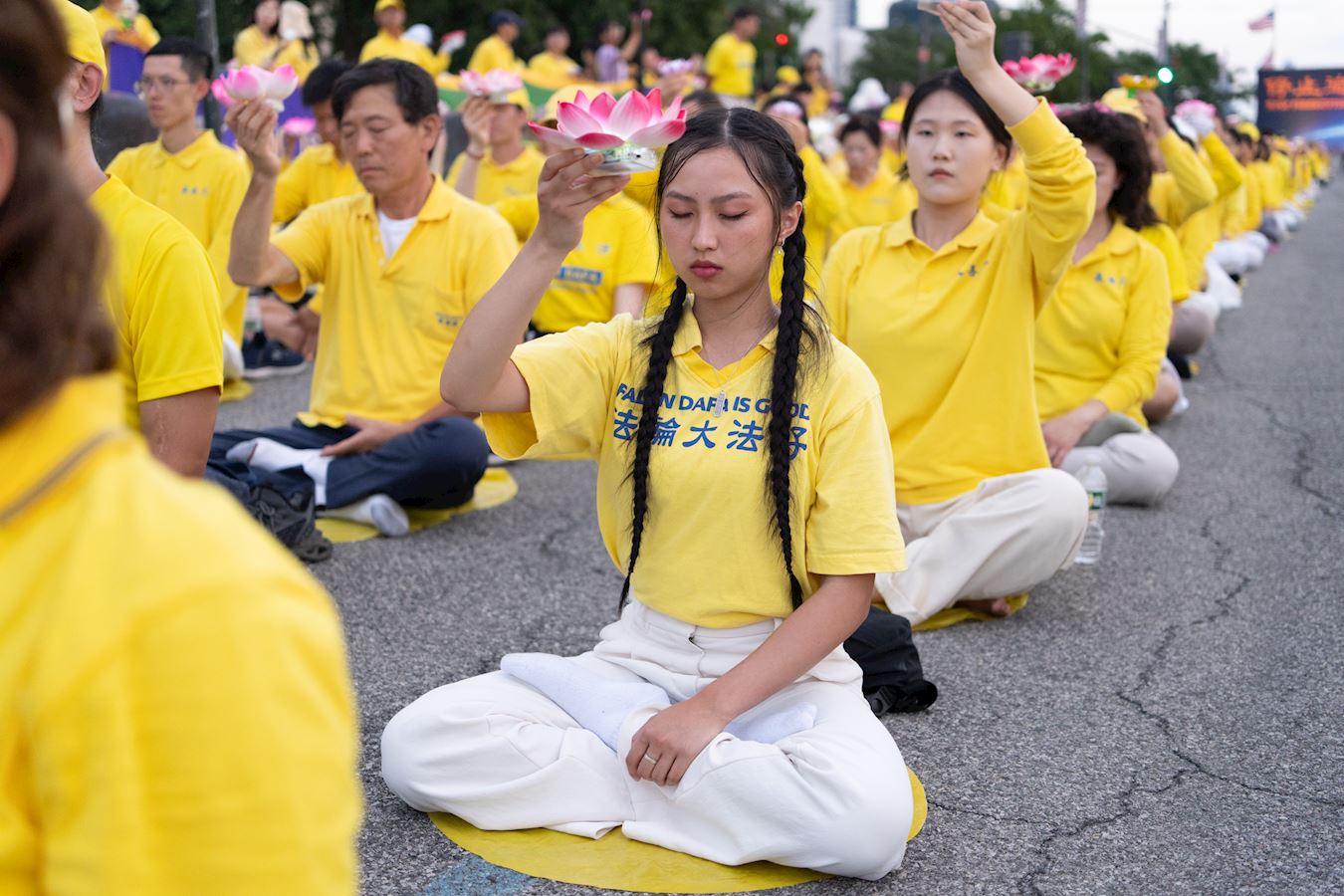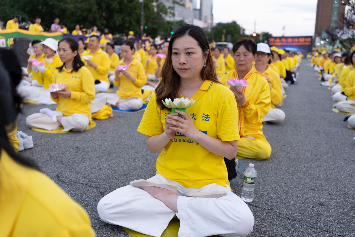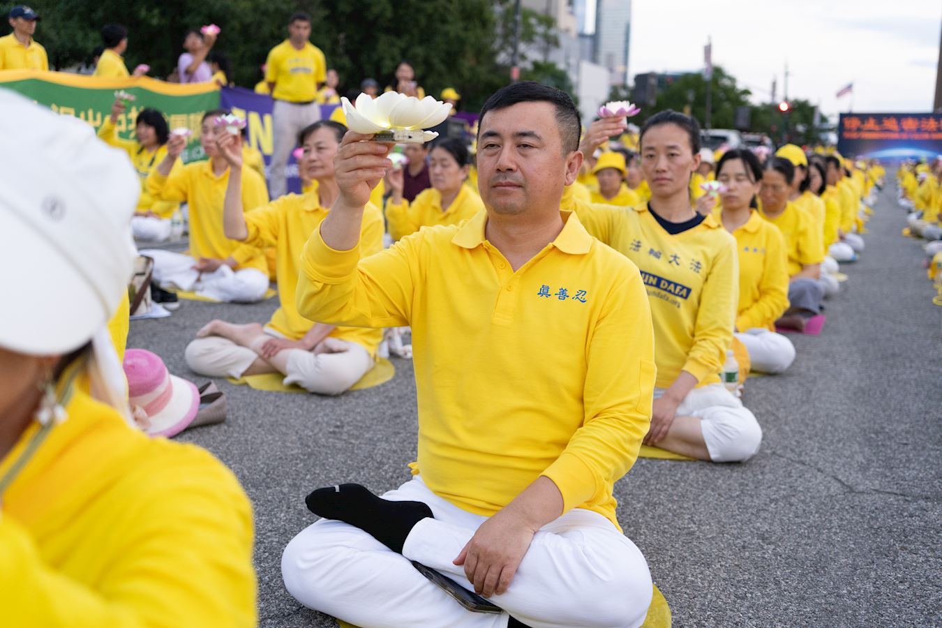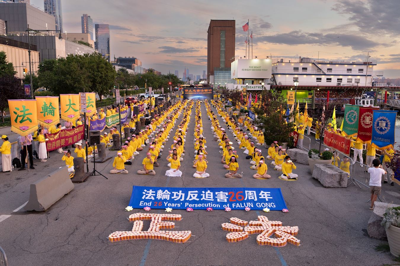 【明慧网二零二五年七月二十三日】二零二五年七月二十日傍晚,纽约部分法轮功学员在中共驻纽约领事馆对面的哈德逊河畔,举行烛光夜悼,悼念二十六年来被中共迫害离世的法轮功学员,呼唤正义良知,要求中共停止迫害。 来自不同族裔、不同年龄的法轮功学员们用横幅筑起一道道“真相长城”:“法轮大法”“ 真、善、忍”“停止迫害法轮功”“制止中共活摘法轮功学员器官”“打倒中共恶魔”“庆祝4.49亿人退出中共党团队”“法轮大法洪传世界”。同时集体炼功,向过往民众展示平和的法轮功功法,讲述法轮功真相。