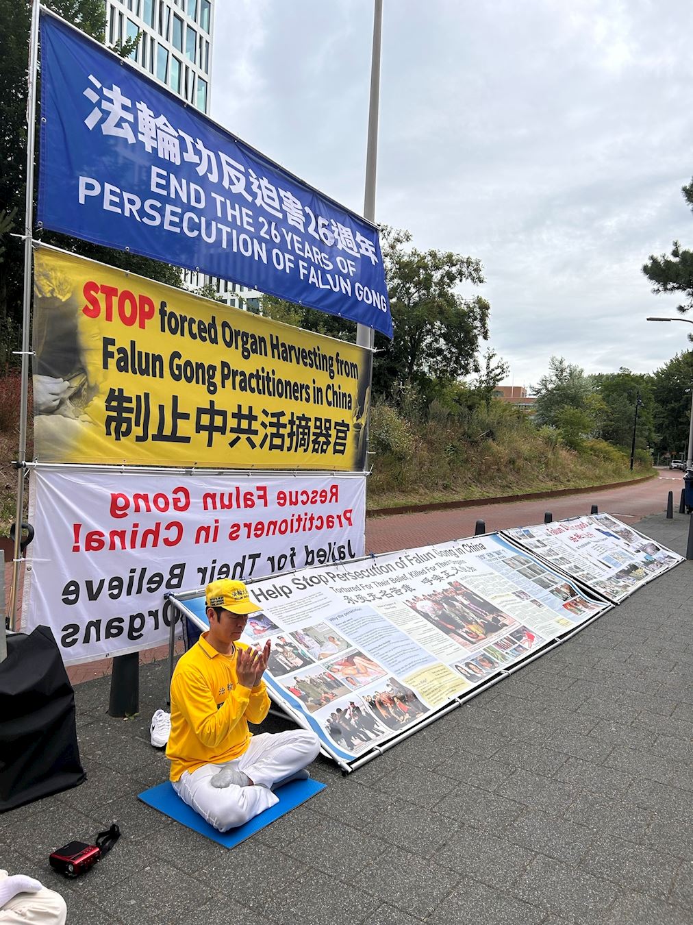 十八日上午,学员们在海牙中使馆前门和后门悬挂“法轮功反迫害二十六周年”“停止迫害法轮功”“停止中共活摘器官”及“法轮大法好,真善忍好”“法轮大法弘传世界一百多个国家” 等条幅,抗议中共无理镇压,荷兰“人权无国界”组织致信支持法轮功反迫害。