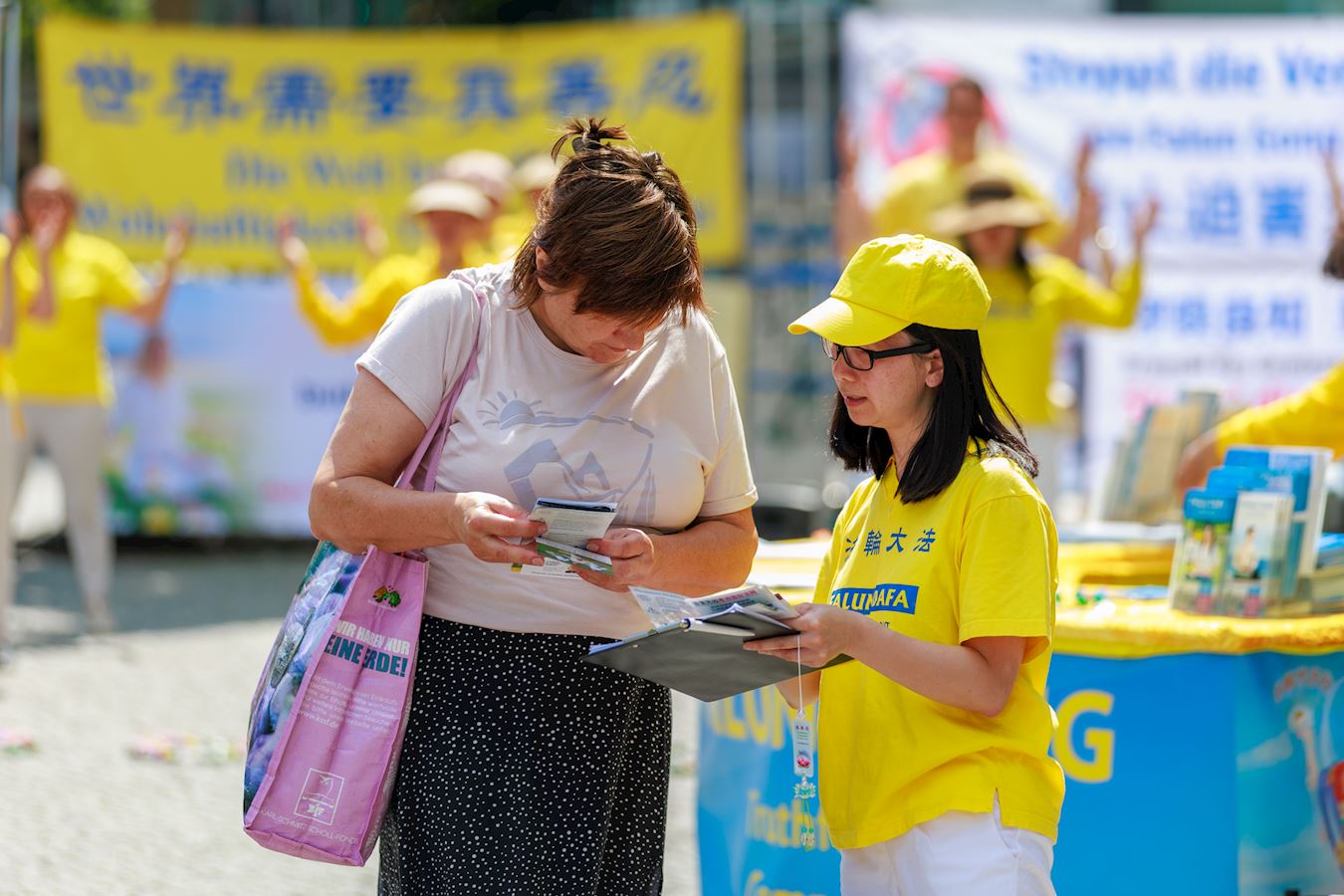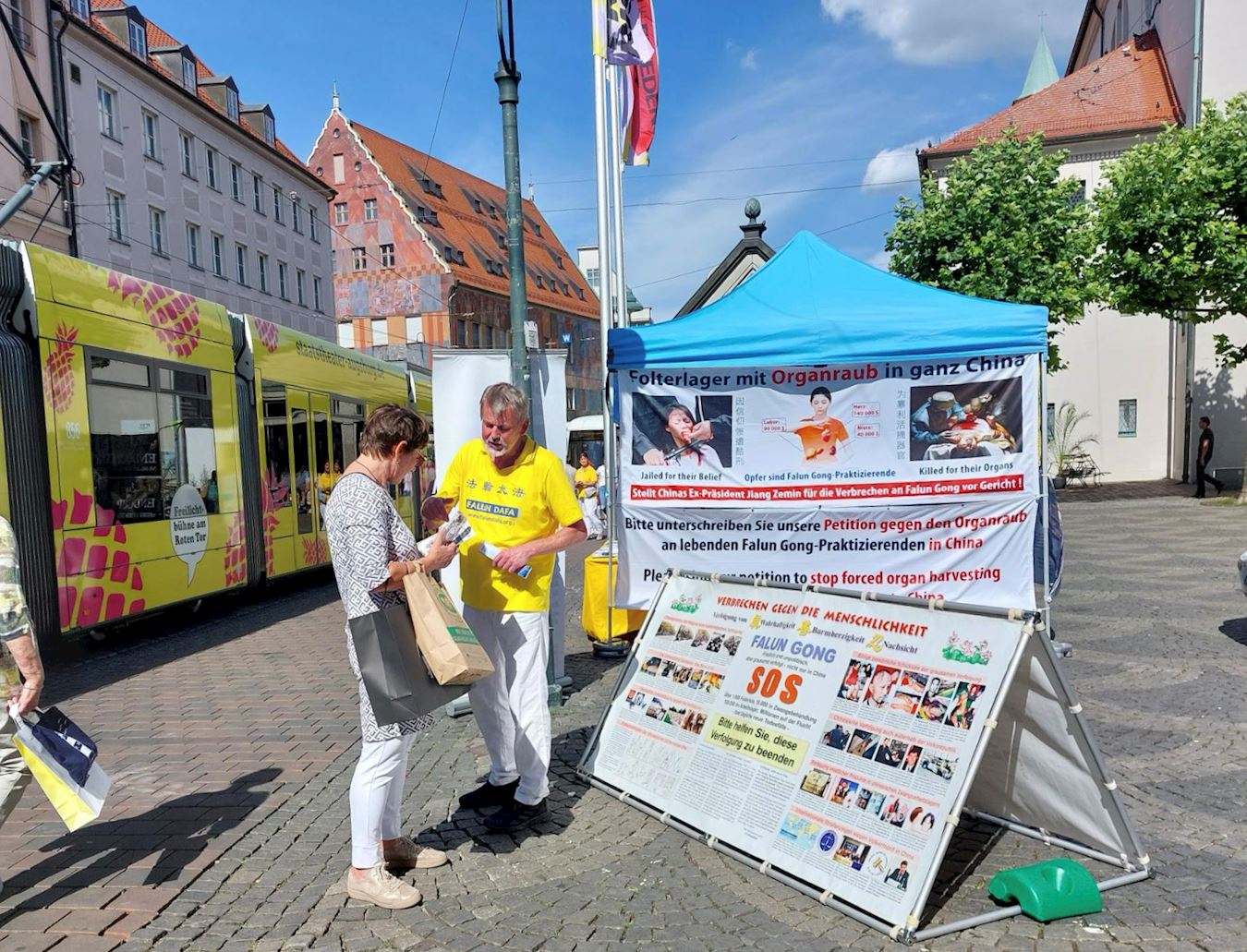 七月十二日,法轮功学员在南部奥格斯堡举办活动,一位大陆女士观看学员炼功,并一直愉快地与不同的学员交谈,临走前她同意用化名退出中共邪党。