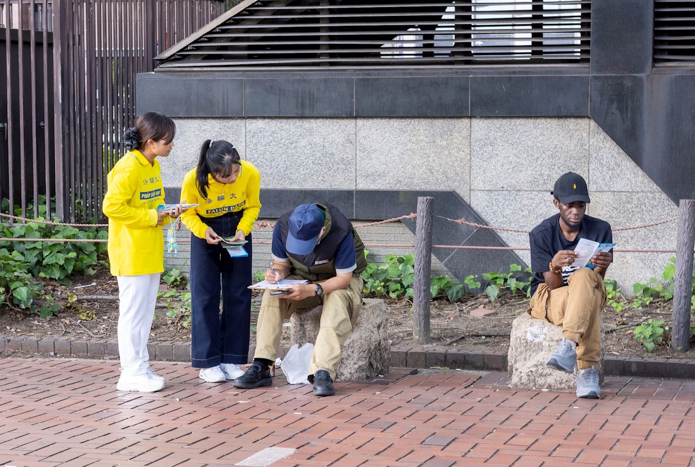 当天的征签活动得到了许多民众的支持。一位名叫柴野(Mr.Shibano)的先生,在听完法轮功学员讲述的真相后,毫不犹豫地在制止中共活摘法轮功学员器官签名板上签下了自己的名字。他对学员说:“加油,我支持你们。”