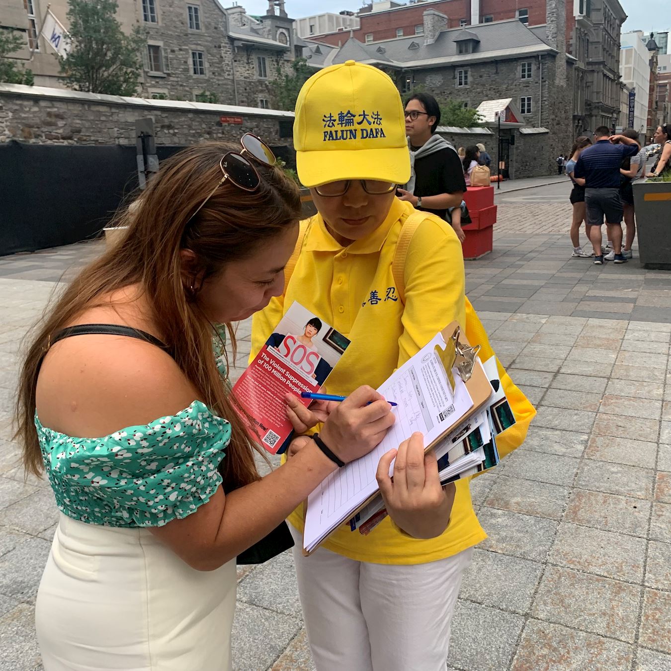 兵器广场是蒙特利尔著名景点,一拨拨的游客驻足观看真相展板,聆听法轮功学员的发言。有人流泪了,许多人在征签信上签名,支持法轮功学员反迫害。