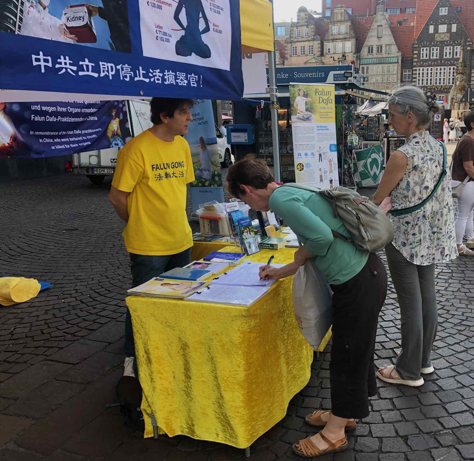 信息桌前一位老先生看着一条横幅,上面有一小部份受迫害者的名字和照片。他感叹道:“这(中共)是恐怖的化身,的确是恐怖的化身。” 读到遇难者的名字,看到他们的照片,不来梅人明显受到触动。