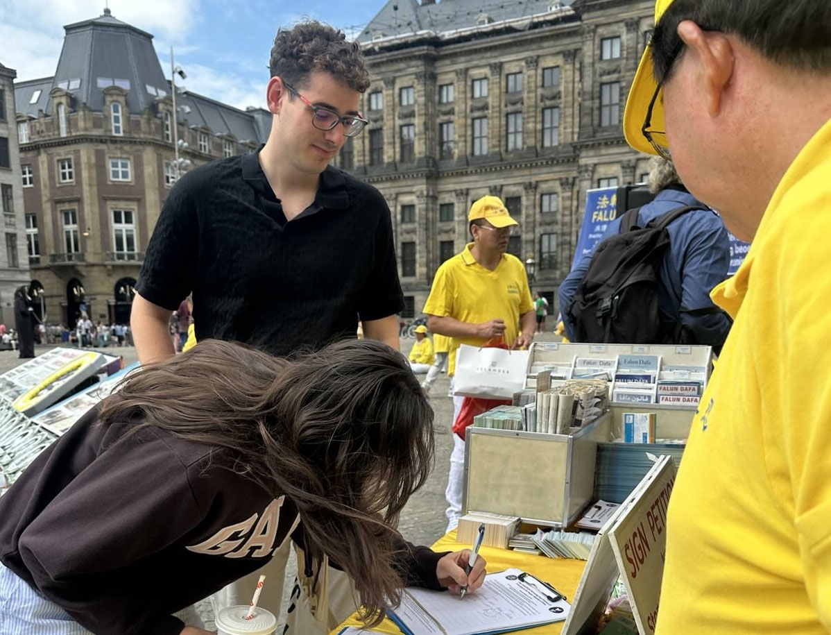 一对瑞典父子也来签名支持法轮功反迫害,父亲说:“我觉得支持中国法轮功学员很有意义,因为我的儿子就是来自中国的,我很高兴,他能帮助他出生的那片土地上的人。”儿子是两岁时被父亲收养的,听到法轮功学员介绍的真相后,他说:“真善忍很好,如果每个人都遵循这三个原理,世界就会更加和平,人们也会更加友善。”“我对中共不太了解,但当我听到这个消息(中共迫害法轮功)时,我不明白他们为什么要这么做。我觉得这真是一个残酷的体制。这确实很糟糕。我不太喜欢它,也不支持它。”