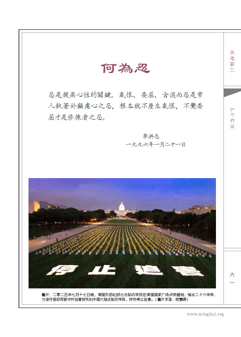 “二十六年来,海内外法轮功学员面对迫害,始终和平理性。他们不是为自己发声,而是为全人类的良知,为坚守真、善、忍的价值。沉默帮不了受害者,只会纵容加害者。”