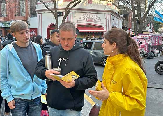 7月20日,在阿根廷首都布宜诺斯艾利斯唐人街,法轮功学员打出横幅并摆放展板,和平地并散发传单表达他们对信仰自由的坚持。