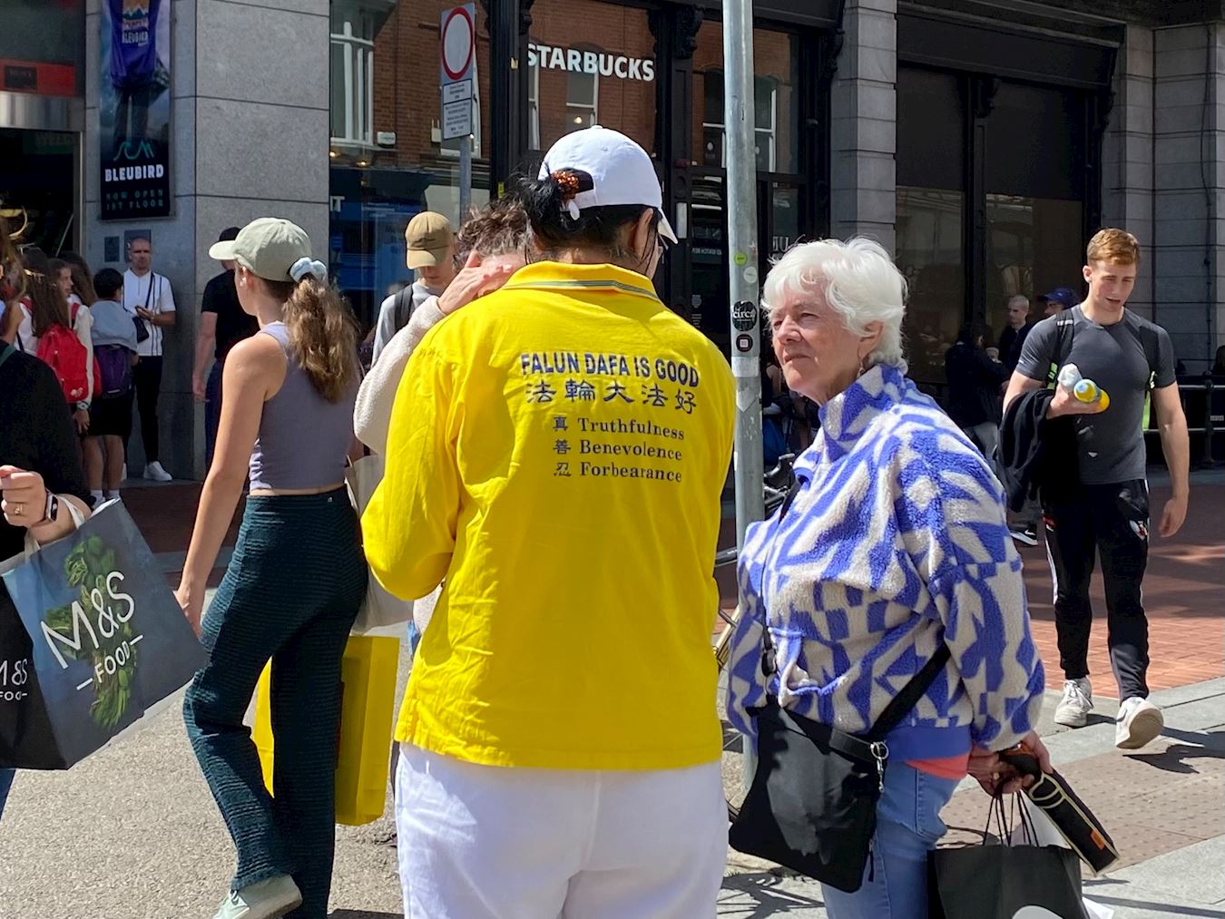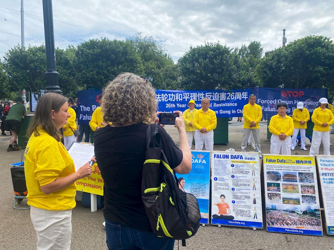 欧拉(Orlaigh)刚参加完游行,路过集会现场,看到学员在集体炼功,令她停下了脚步。“很平和,刚开始我也太了解,我觉得这些人看起来优雅又祥和,我就想看看他们是在做什么。但是当我阅读(展板),我意识到这是一件很重要的事情。”欧拉说。