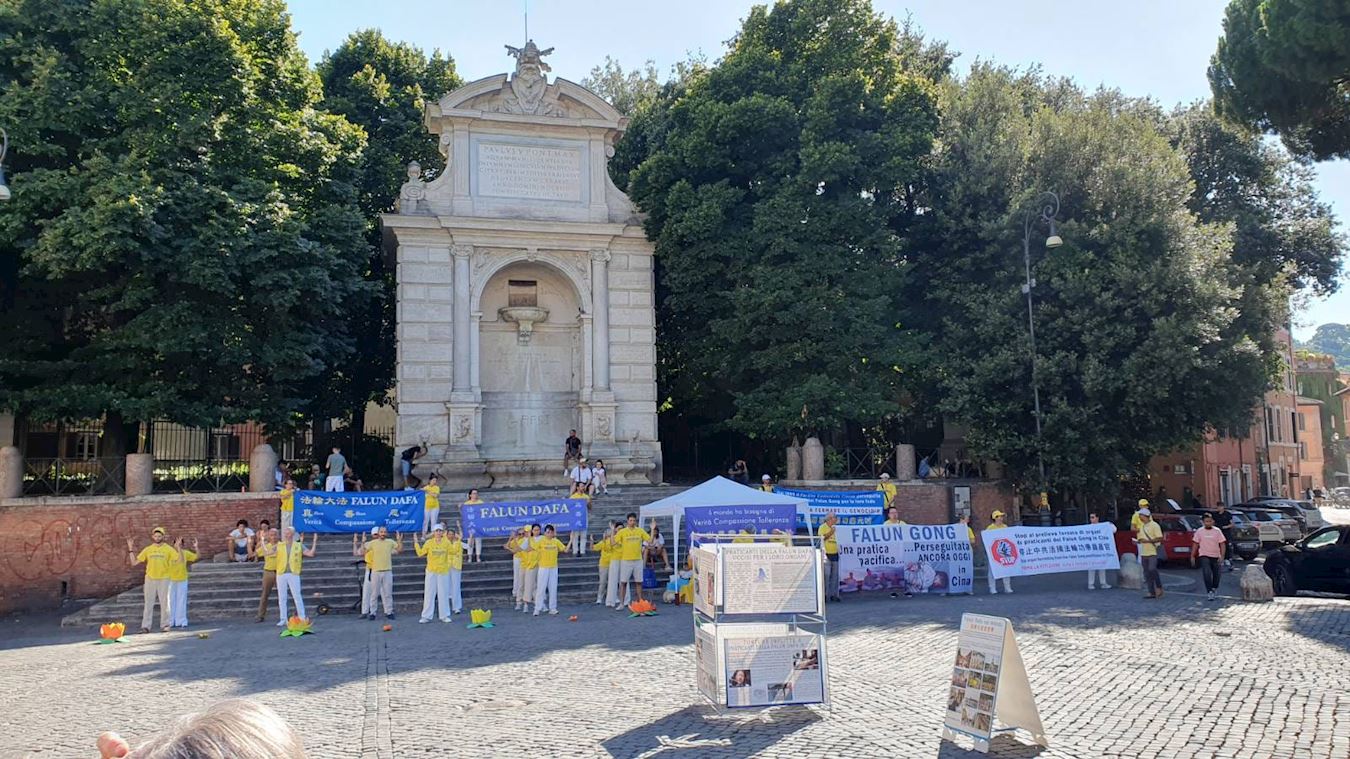 七月五日星期六下午,在罗马特里卢萨广场(Piazza Trilussa),法轮功学员举行了反迫害和平抗议活动。正值意大利炎热的盛夏季节,骄阳似火,下午宽阔的特里卢萨广场周围,绿荫下聚集了避暑休闲的民众及游客。