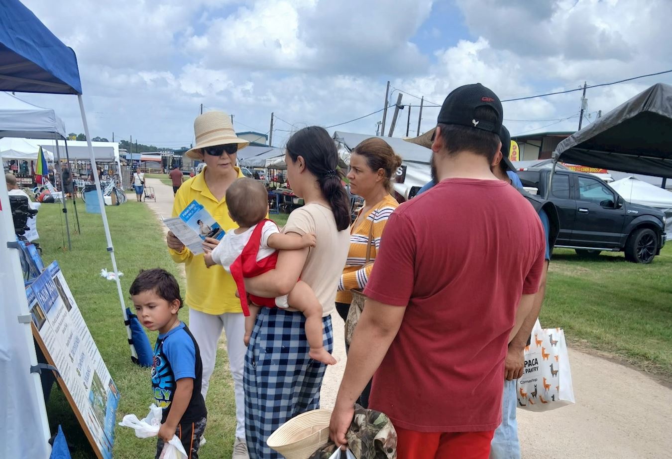 凯(Kay)居住在路易斯安那州,这周应朋友之邀来德州游玩,国庆这天与四、五朋友来集市,在这里听到了法轮功的信息。与她一起听真相的黑人女孩对炼功非常感兴趣,拿走了当地炼功点及教功信息。