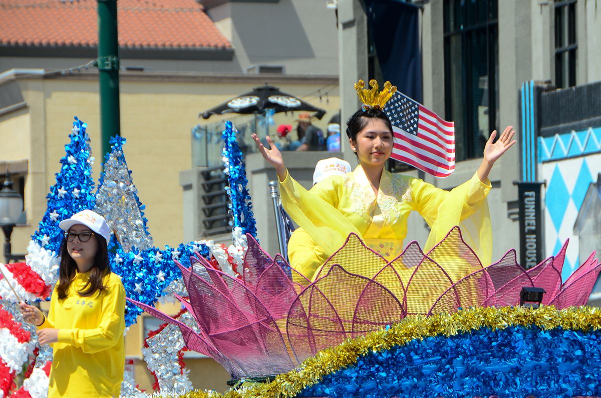 法轮功团体是今年游行中人数最多、最长的队伍。游行方阵以美西天国乐团带领,紧随其后的是一辆装扮华丽的花车。车身以美国国旗红、白、蓝三色为基调装饰,车上的莲花台上,坐着身穿传统仙女服饰的学员。花车后方还有身着黄色上衣、展示功法动作的学员。