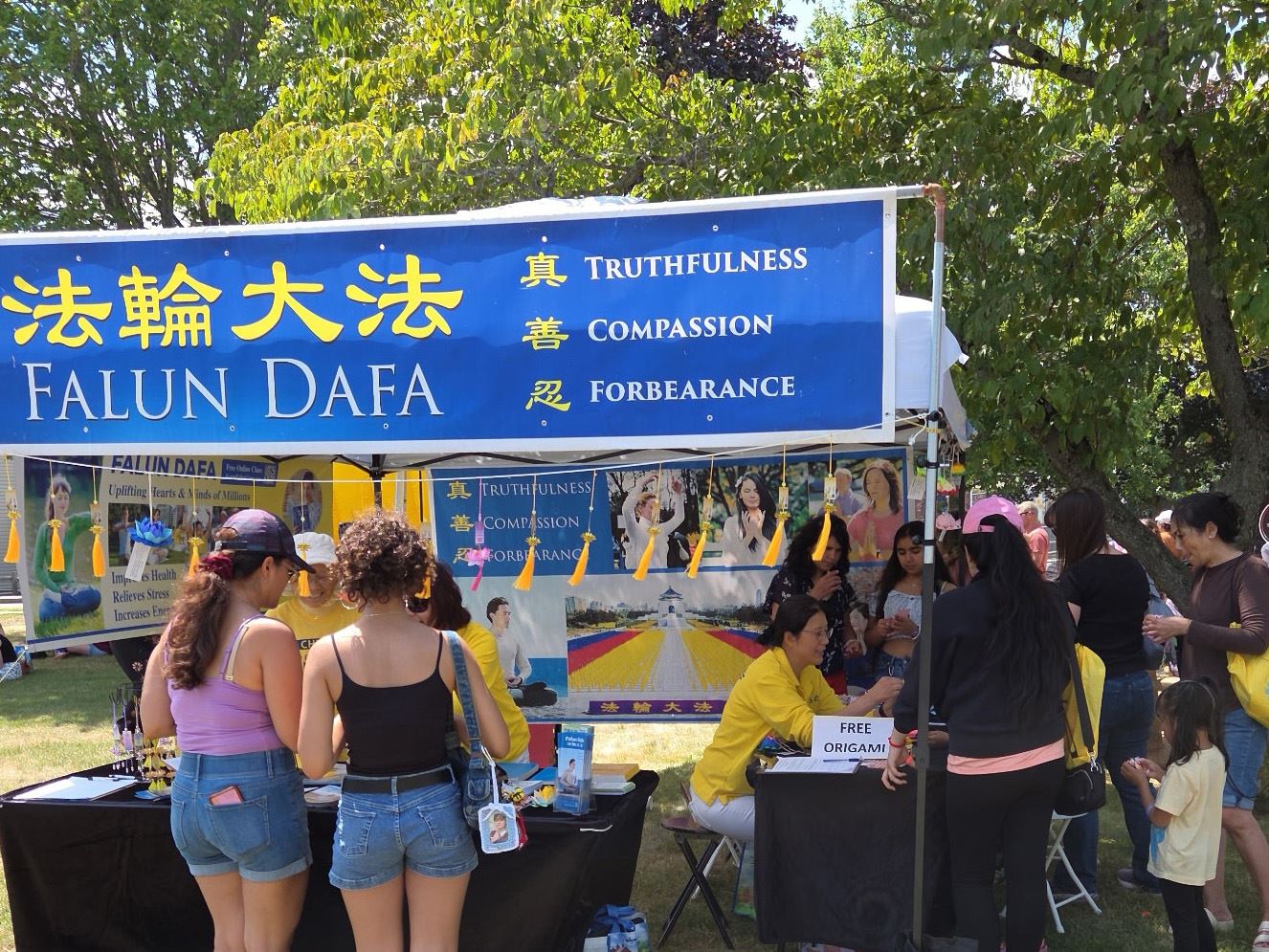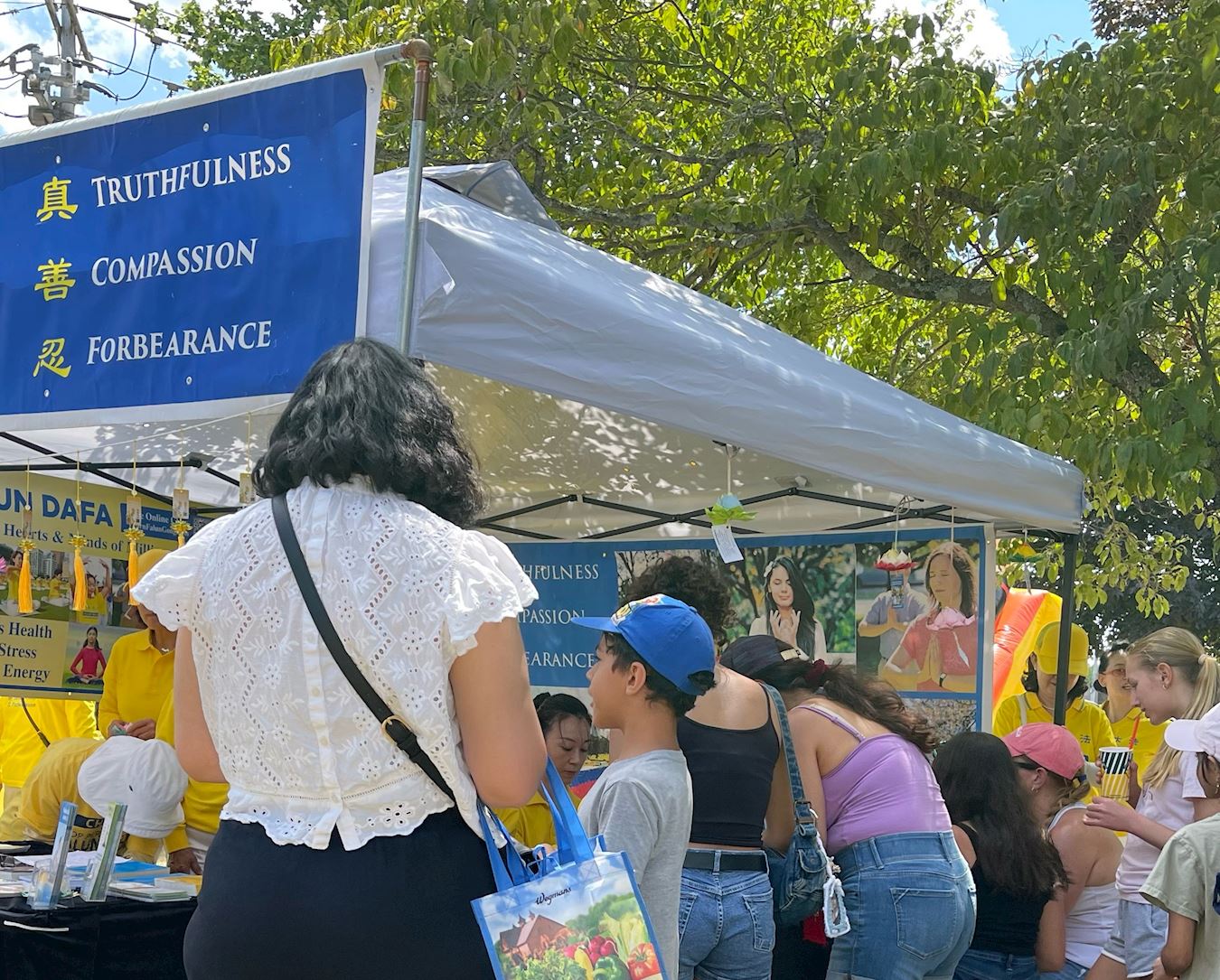 有两位华人老夫妇站在展位前方拍照。她对学员说,我知道你们是法轮功的,是好的功法。她犹豫了一下走到摊位上拿了法轮功简介资料,她说:“这是英文的,我看不懂。”学员就递给她一份中文的传单,她急忙的把传单收入袋内。学员回头取了一本《九评共产党》送给她的先生,她先生非常高兴地把书收下了。学员感受到,这对夫妇长期受中共的宣传下,不敢接近法轮大法,今天终于有机会得到法轮功真相资料了。