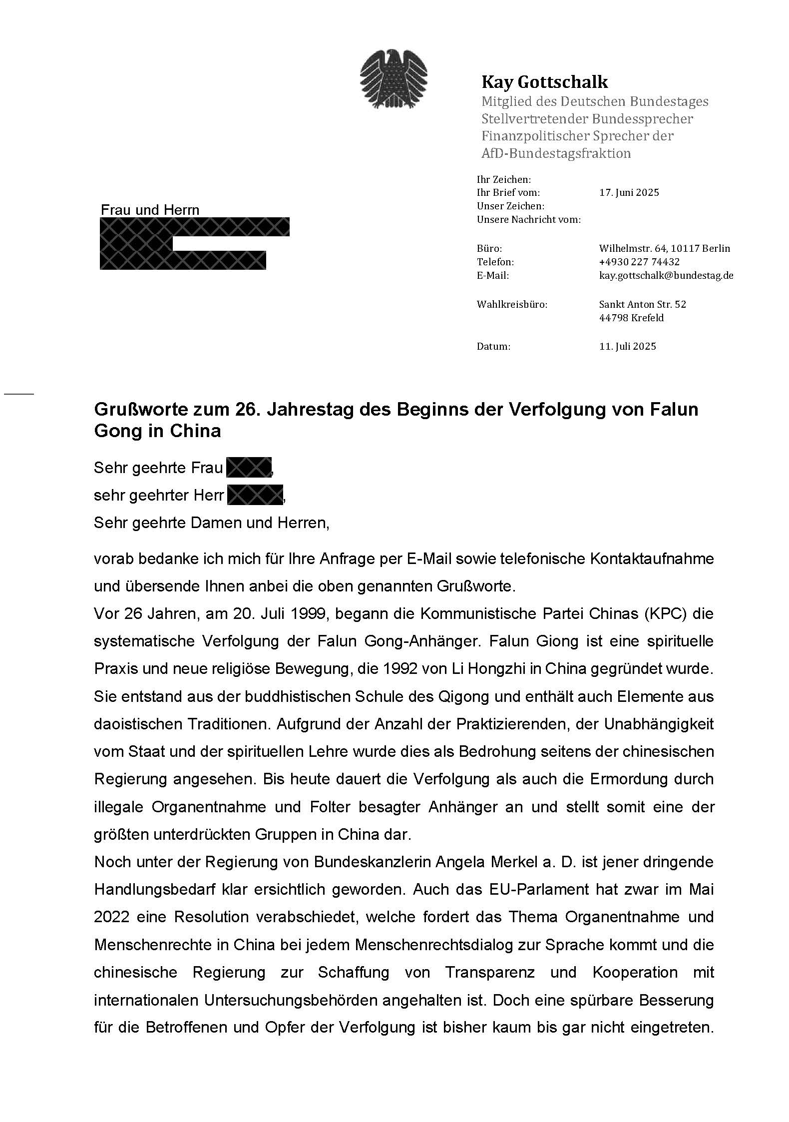 | 图2~3:德国联邦议员凯·戈特沙尔克(Kay Gottschalk, MdB)的来函。 | |