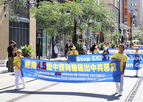 加拿大魁北克法轮功学员8月16日在蒙特利尔市中心举行游行和集会,庆祝4.5亿中国人退出中共党团队组织,呼吁更多民众认清中共邪恶本质。