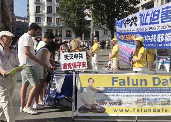 西班牙法轮功学员7月19日在马德里市卡亚尔广场举行反迫害征签活动。路过的市民及游客被活动现场上的横幅内容所吸引,驻足了解详情。