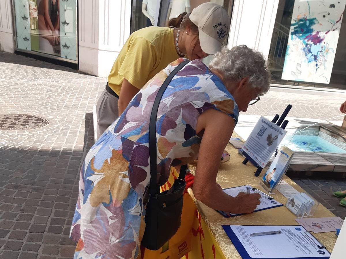 一位导游向她来自罗马的游客团翻译了真相横幅上的内容。随后,几位来自罗马的女性游客在呼吁停止迫害的请愿书上签了名。这位导游从展位上拿了很多真相传单,她希望尽自己所能呼吁停止在中国进行器官活摘。