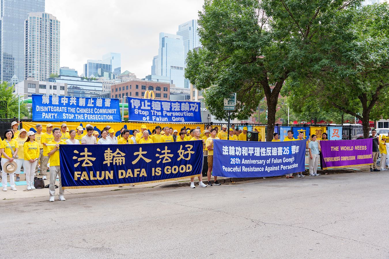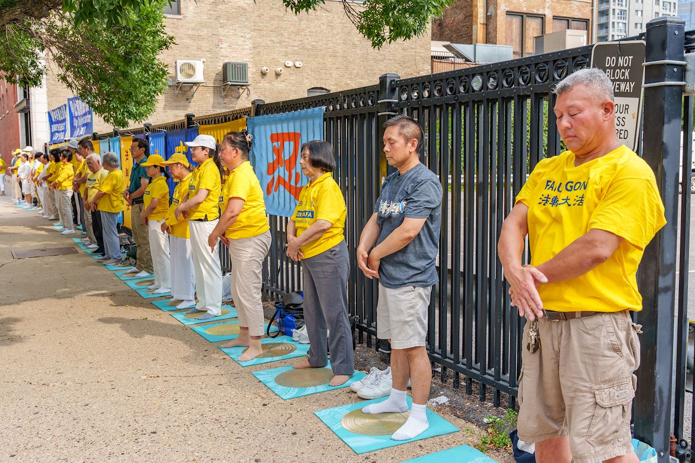 '图1~3:二零二五年八月十六日,来自美国中部十多个州的部份法轮功学员在芝加哥中领馆前,举行了和平反迫害的集会,呼吁社会各界共同制止这场残酷的迫害。'