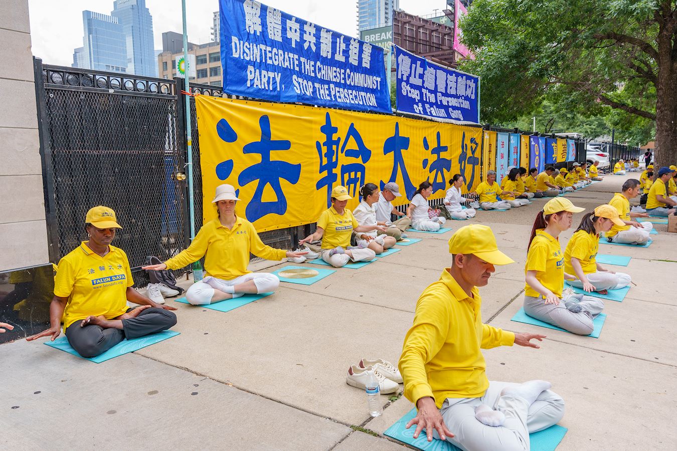 【明慧网二零二五年八月二十日】二零二五年八月十六日下午,美国中部十多个州的部分法轮功学员在中共驻芝加哥领馆前举行和平反迫害集会。现场,学员们集体炼功,展现出修炼法轮大法的祥和与美好。通过横幅、展板、资料发放、征签以及发言等多种形式,揭露中共持续跨国打压,迫害法轮功,呼吁社会各界共同制止这场残酷的迫害。