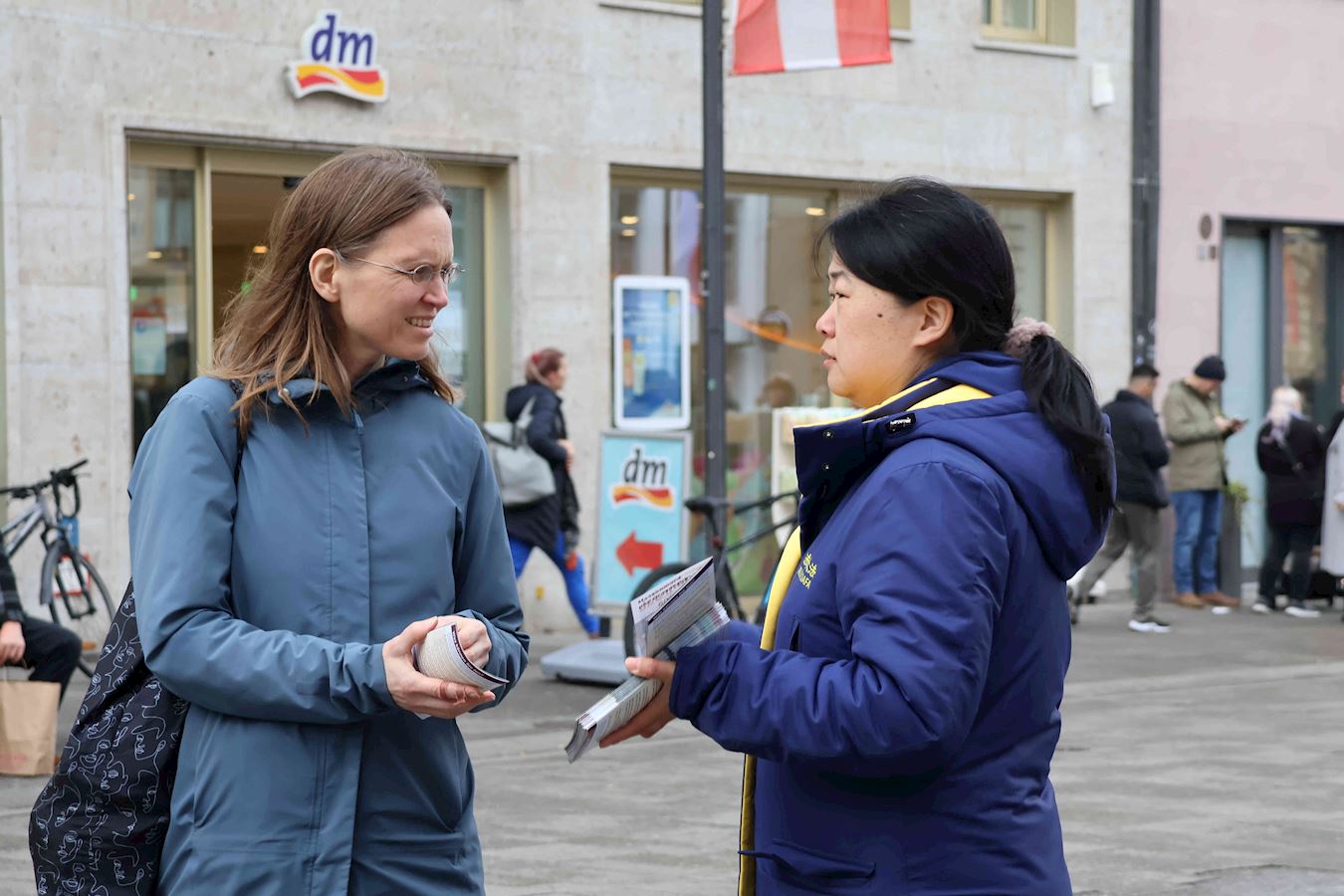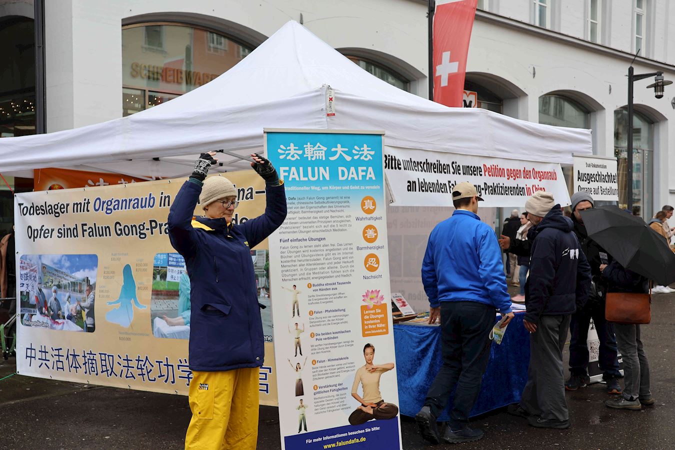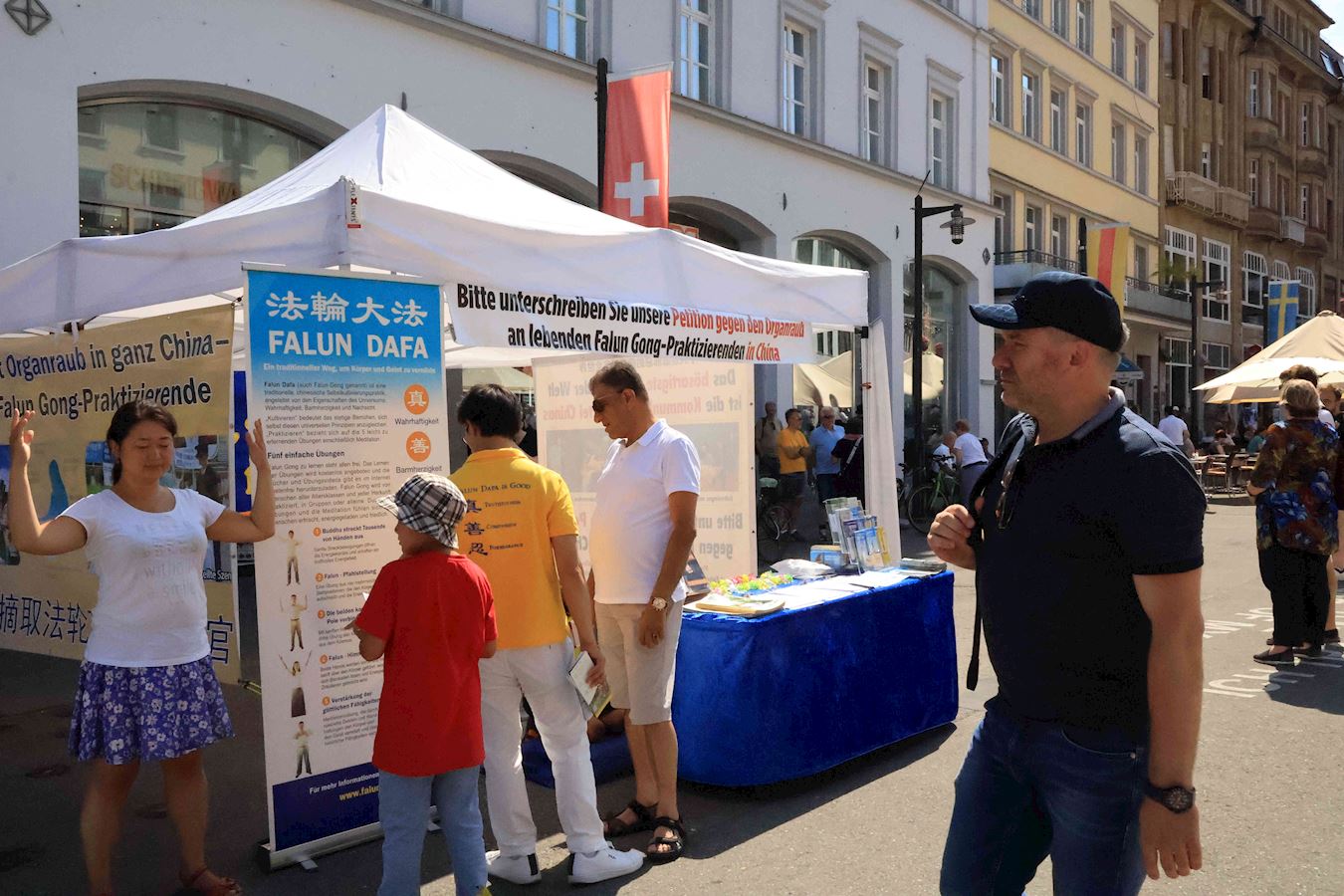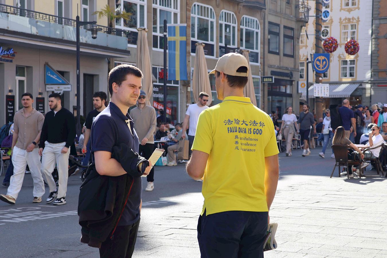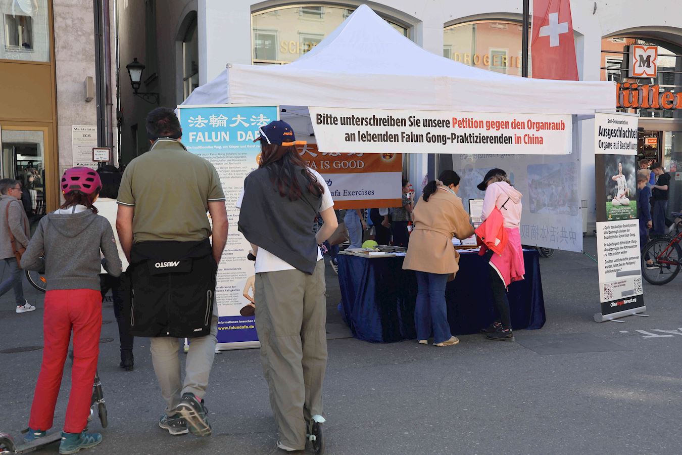 二零二五年二月至七月的十五个周六,来自德国和瑞士的法轮功学员先后在康斯坦茨的轮渡码头及市中心马克特广场(Marktstätte)设立展位讲述法轮功的真相,很多人在得知中共残忍迫害法轮功二十六年之久,甚至活摘法轮功学员器官的罪恶后,纷纷签名希望共同制止中共的反人类罪行。