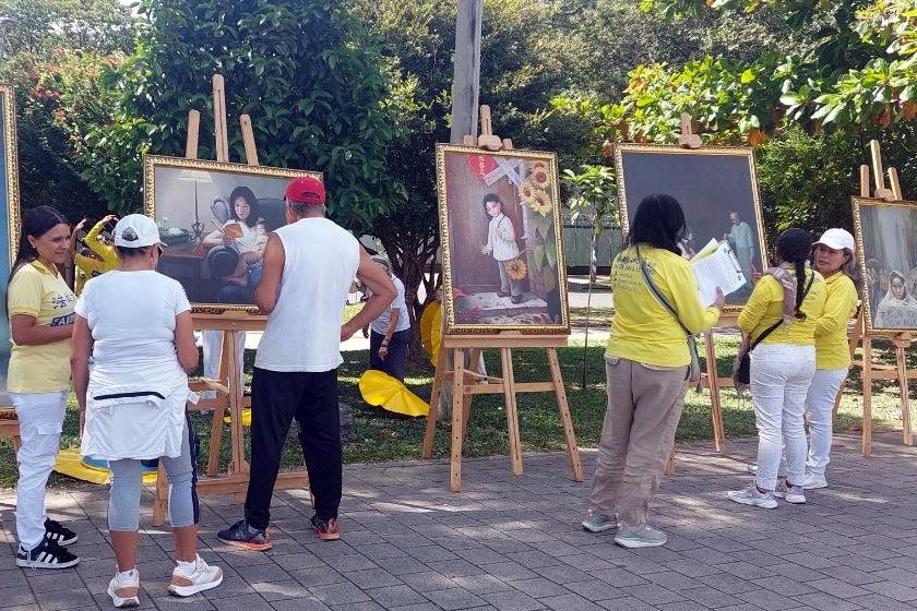 来自麦德林、里奥内格罗、马里尼利亚和埃尔雷蒂罗等城市的部分法轮功学员在哥伦比亚第二大城市麦德林的阿塔纳西奥·吉拉尔多体育中心前演示法轮功功法,并展示“真善忍国际美展”的部分画作。这些画作吸引了路人驻足观看,不仅因为其精美的艺术性,更因为这些画作所展现的内在平和,以及画作描绘的中国法轮功学员所遭受的残酷迫害。