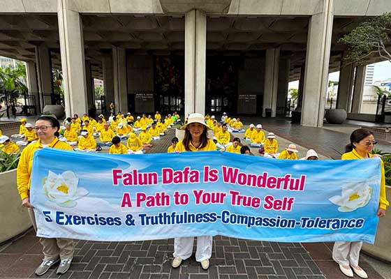 洛杉矶法轮功学员8月26日在市政府前展示五套功法、向往来民众讲述真相和征集反迫害签名,呼吁各界一同制止中共的跨国镇压与渗透。