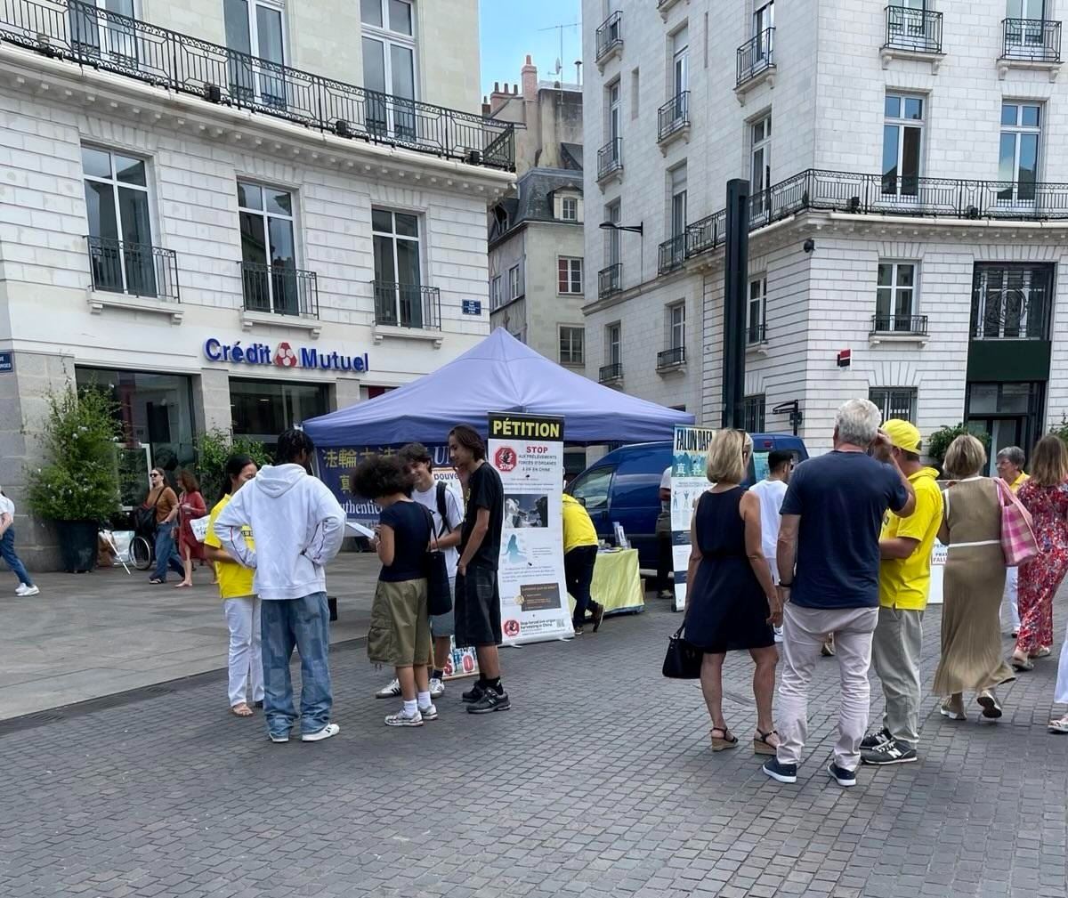 居住在南特的退休妇女玛丽-保尔(Marie-Paule)对法轮大法表示了浓厚的兴趣。得知这种修炼方法及其修炼者在中国已经遭受中共迫害二十六年后,她表示这是不可理解的。当她得知修炼者被当作器官库时,她感到愤怒。她还表示,她的肾脏功能不佳,对她来说要么是移植,要么是透析。然后她补充说,不应该去中国助长这种交易。在离开之前,她签署了请愿书,并拿了传单资料以便学炼法轮功。她感谢法轮功学员的行动。