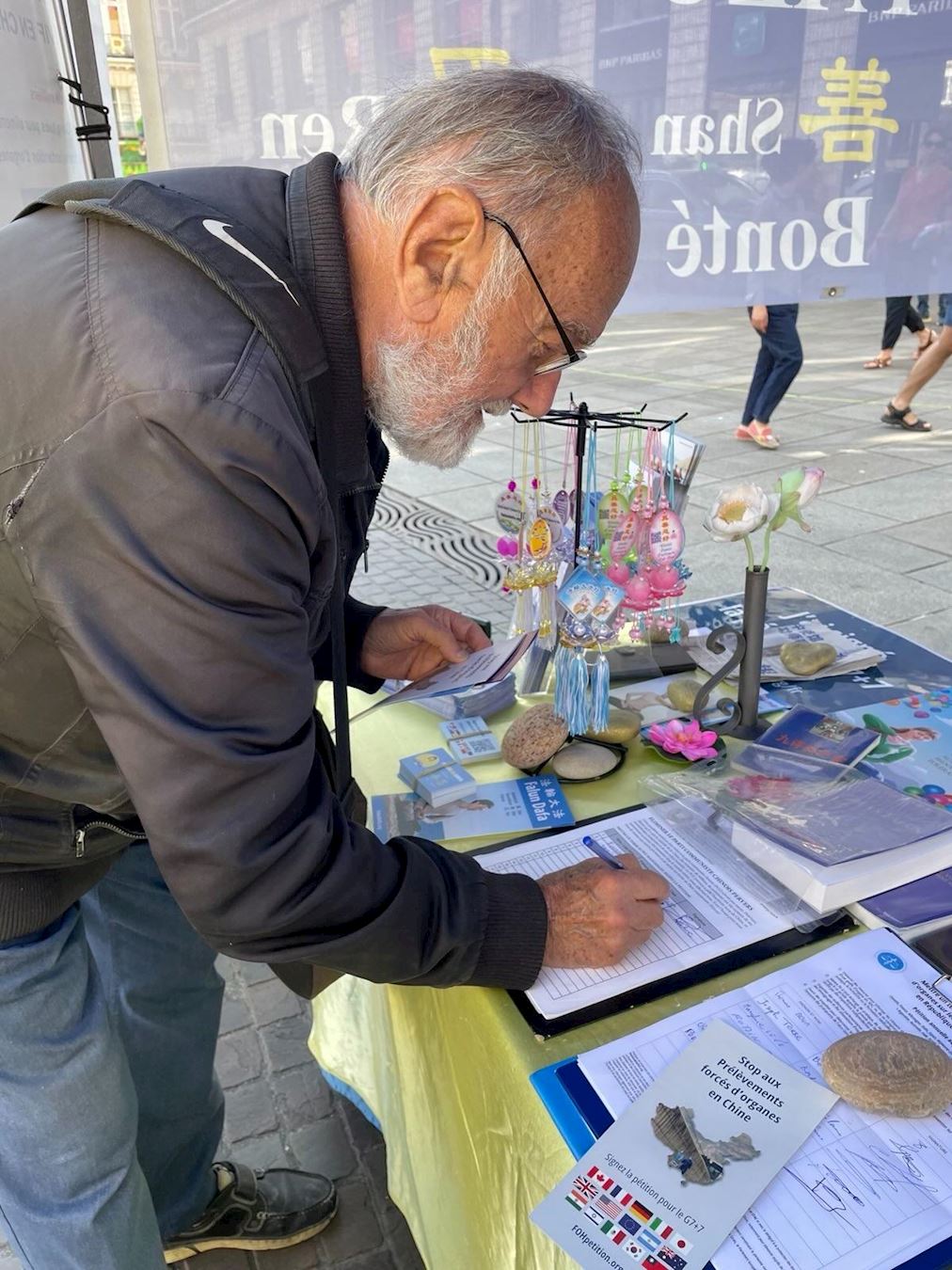 一位居民提到法国还有更重要的事情需要处理时,法轮功学员真心与他交谈,解释这个议题确实非常重要且严重,许多人,包括儿童、女人和男人,都在遭受极大的痛苦,甚至有些人在监狱或医院中因强迫器官摘取而死于可怕的情况。听完这些解释后,他签署了请愿书,表示感到非常震惊。