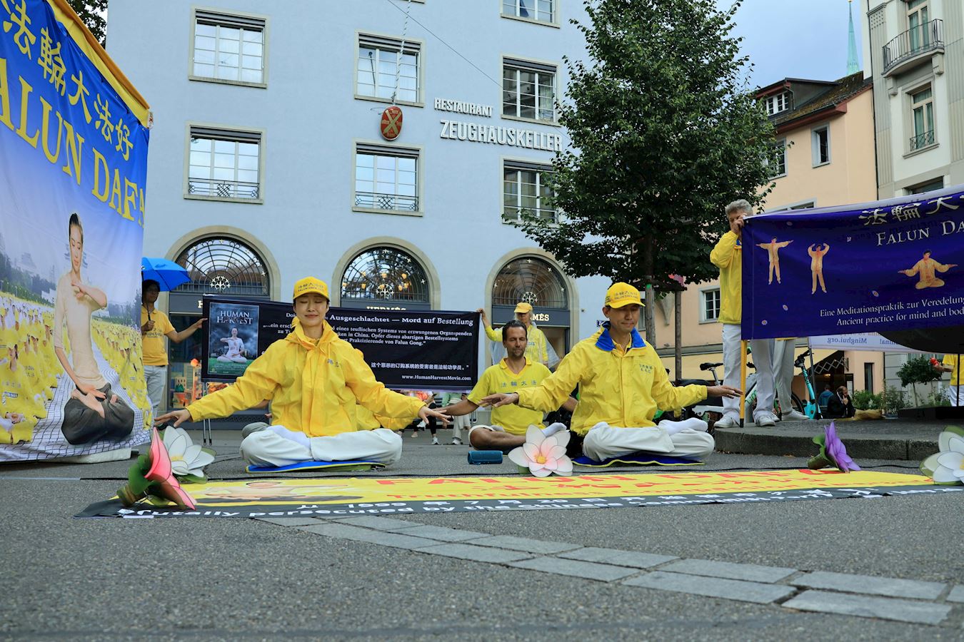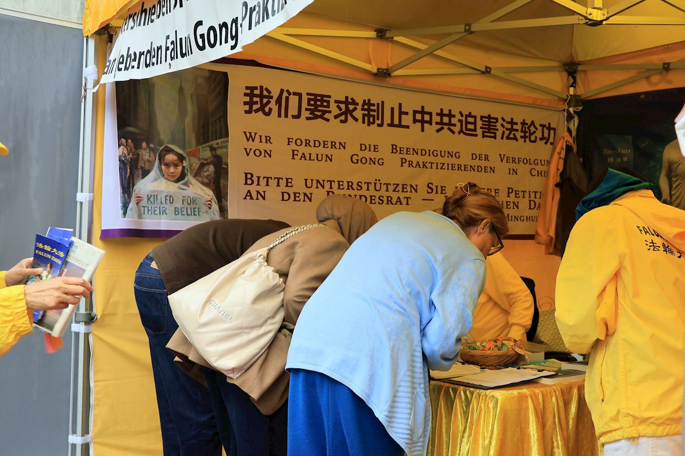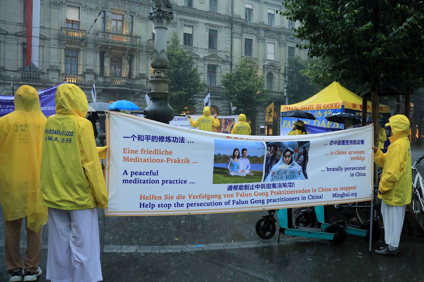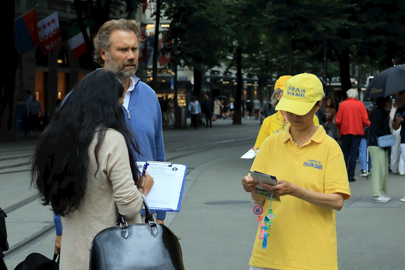 【明慧网二零二五年八月六日】(明慧记者高思羽瑞士采访报道)“听到演讲后,我深受触动,又看到征签信息台,我就过来签名,希望能支持法轮功学员。”“看到他们在大雨中矗立不动,我很感动,我想他们一定是为了什么重要的事情,我想知道这是为了什么?”二零二五年七月二十六日下午,在瑞士苏黎世市中心的军械库广场(Zeughausplatz)很多路人放慢脚步,阅读横幅上的内容,倾听演讲,与法轮功学员交谈。