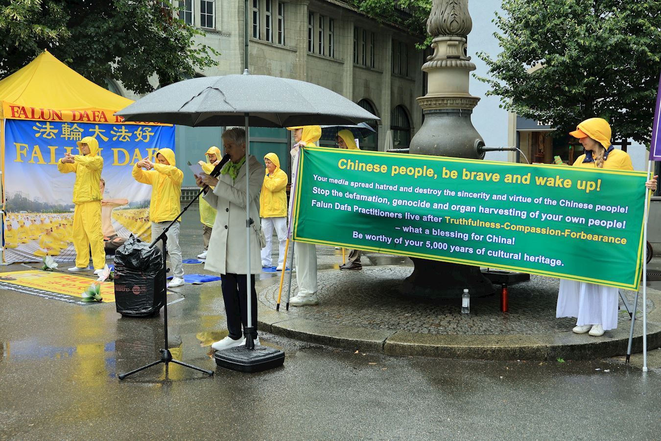 瑜伽师卡门·阿布利丁格(Carmen Ableidinger)非常高兴终于找到了法轮功学员。在瓢泼大雨敲打帐篷的伴奏下,她谈起自己第一次偶遇法轮功的经历。当时她正处于人生低谷,在马略卡岛度假时看到法轮功学员炼功:“他们看上去是如此的幸福,如此满足,人不需要拥有很多,但充实满足非常重要。”她对大法非常感兴趣,也跟着炼了一个半小时:“哇哦,感觉太棒了,”她的喜悦溢于言表:“那是如此的美好,炼功后我感到心中平衡,很充实,我真的非常高兴,很高兴能认识法轮大法。”回来后她一直在网上寻觅,直到活动当天:“我现在知道苏黎世的炼功点了,我太高兴了,找到了你们(法轮功学员),真是太棒了,非常感谢。”