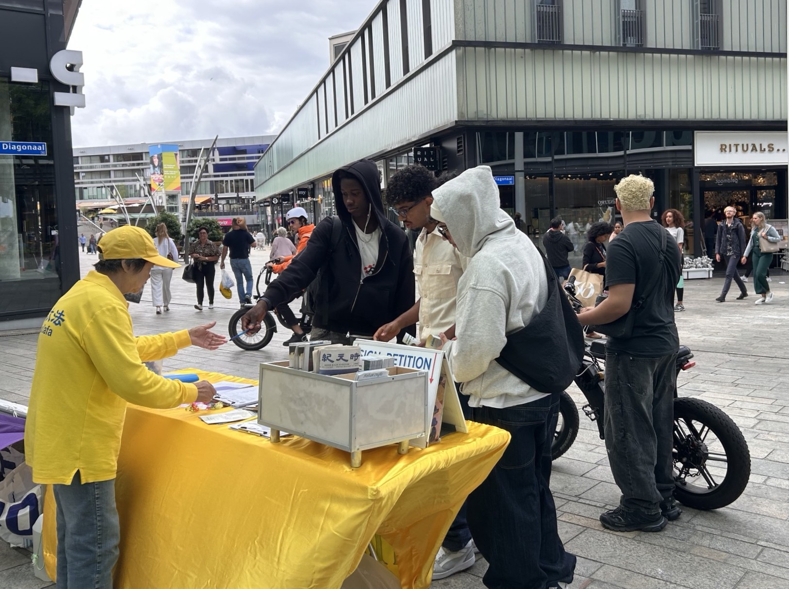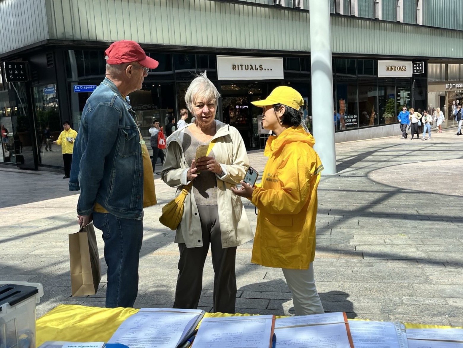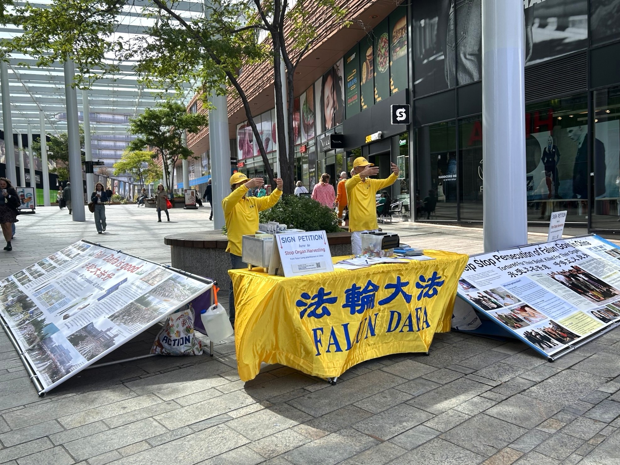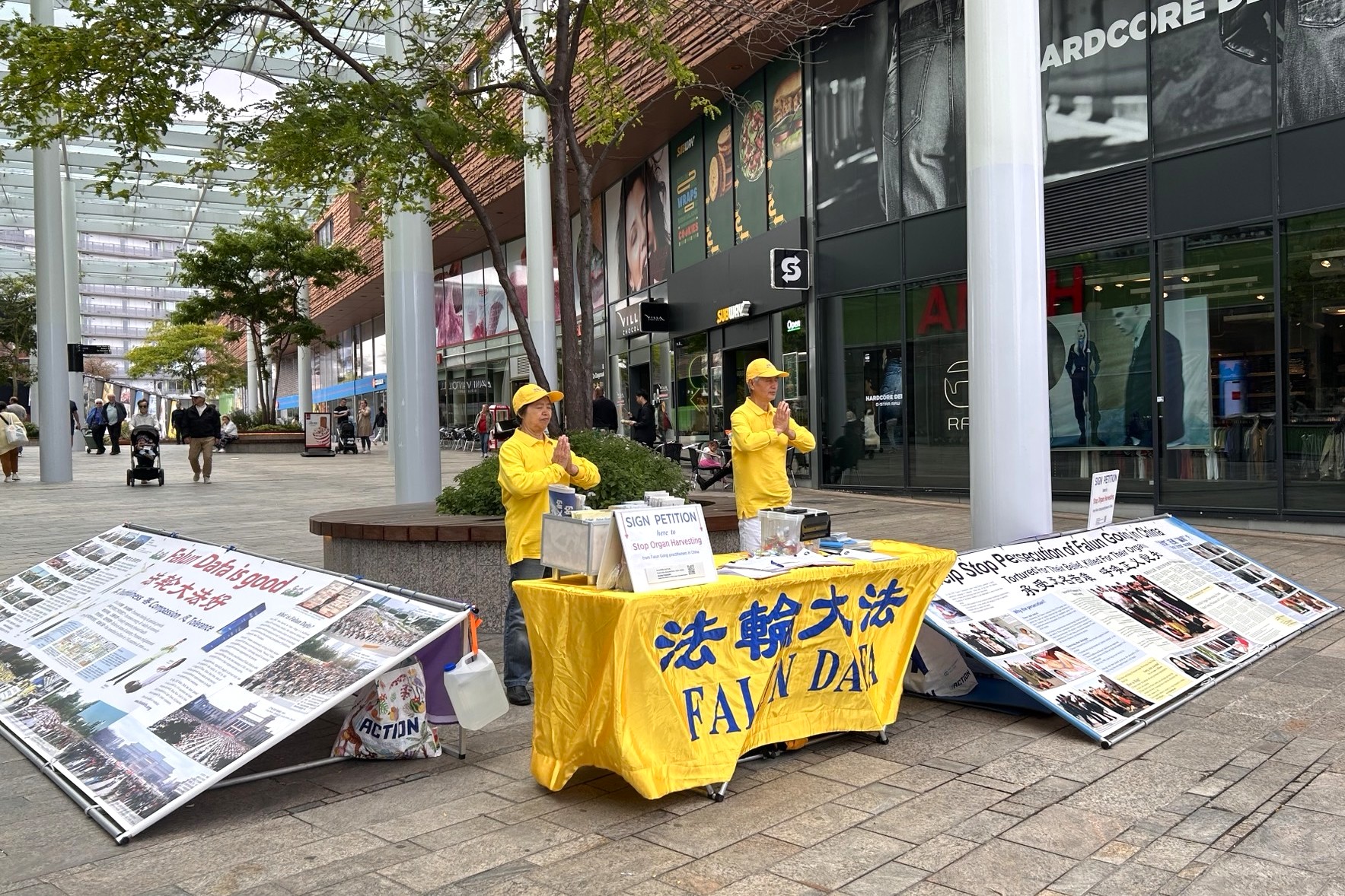 图1~2:二零二五年八月二日(星期六),法轮功学员在阿尔梅勒射手街讲真相。