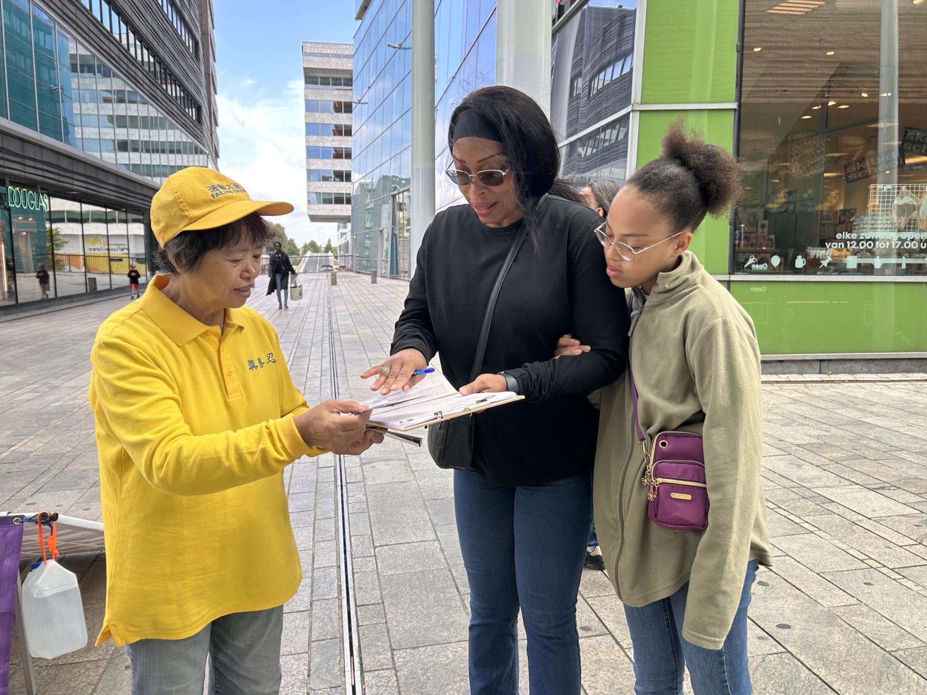 图1~2:二零二五年八月二日(星期六),法轮功学员在阿尔梅勒射手街讲真相